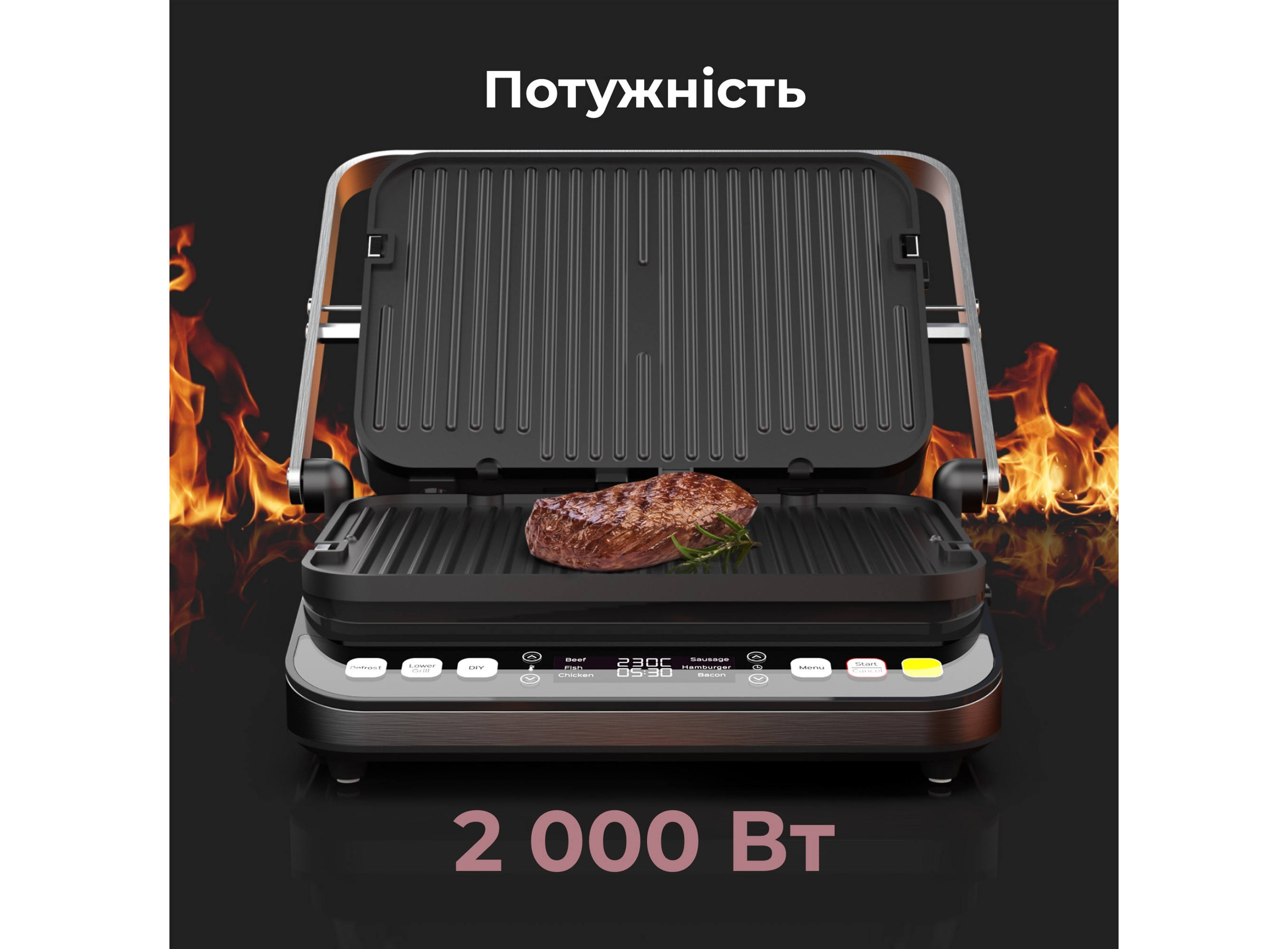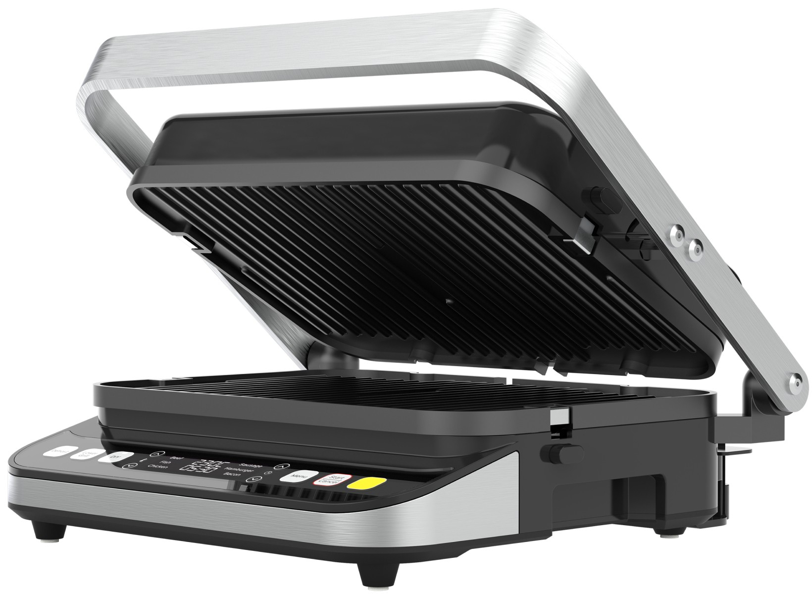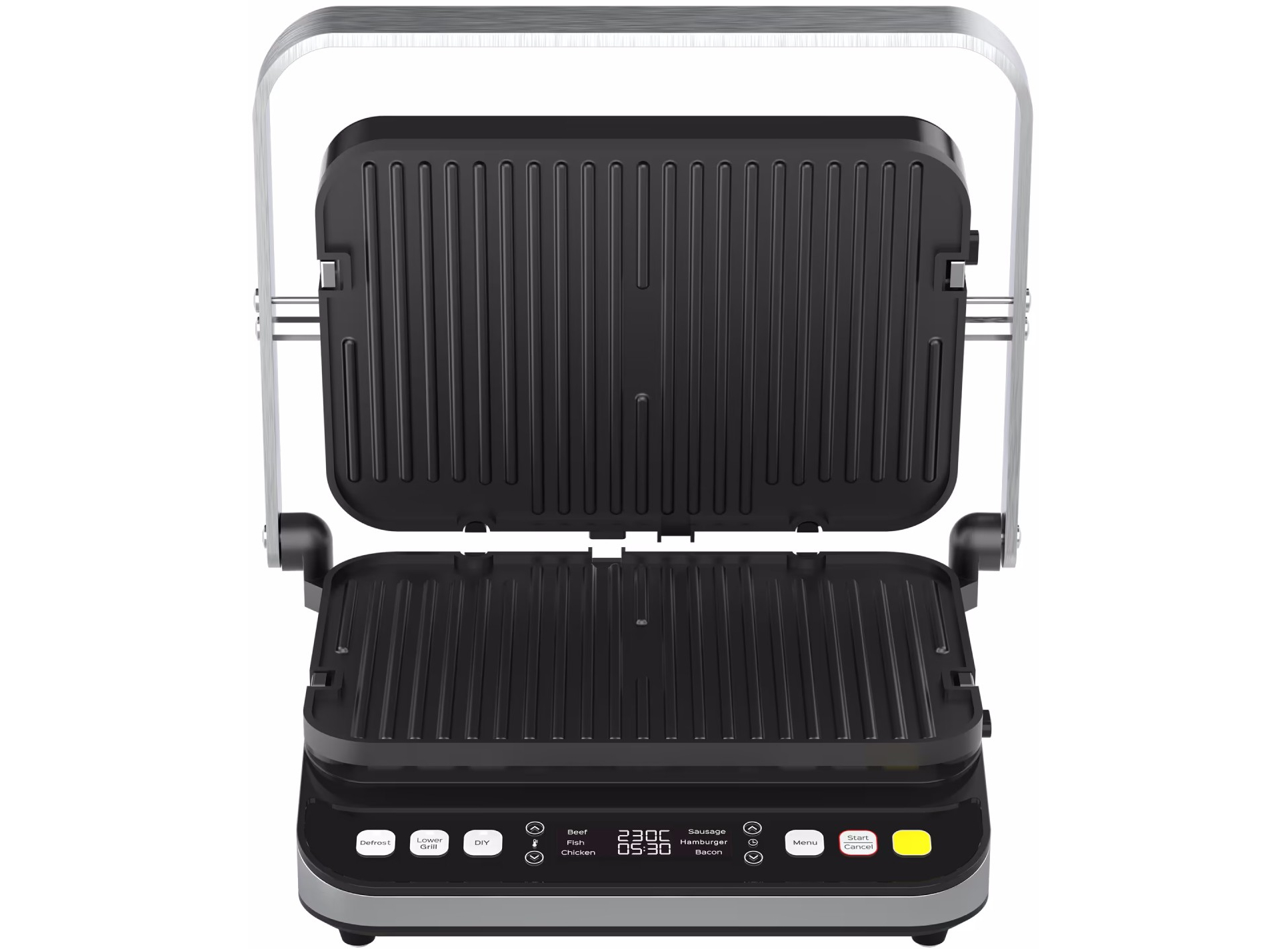 Режимы приготовления: Разморозка/Нижний гриль/Верхний+нижний гриль • 6 автоматических программ • Регулировка температуры • Регулировка времени • Цветовая индикация LED-дисплей • Звуковая индикация • Съемные двусторонние пластины • Ребристая сторона пласти