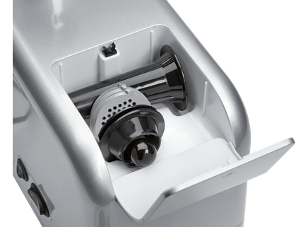 Хромированная передняя панель • Металлическая шея • Металлический лоток для наполнения • Металлическая улитка • Нож из нержавеющей стали • Переключатель ВКЛ/ВЫКЛ • Надежная подставка благодаря ножкам-присоскам • Электропитание: 230 • В, 50 • Гц