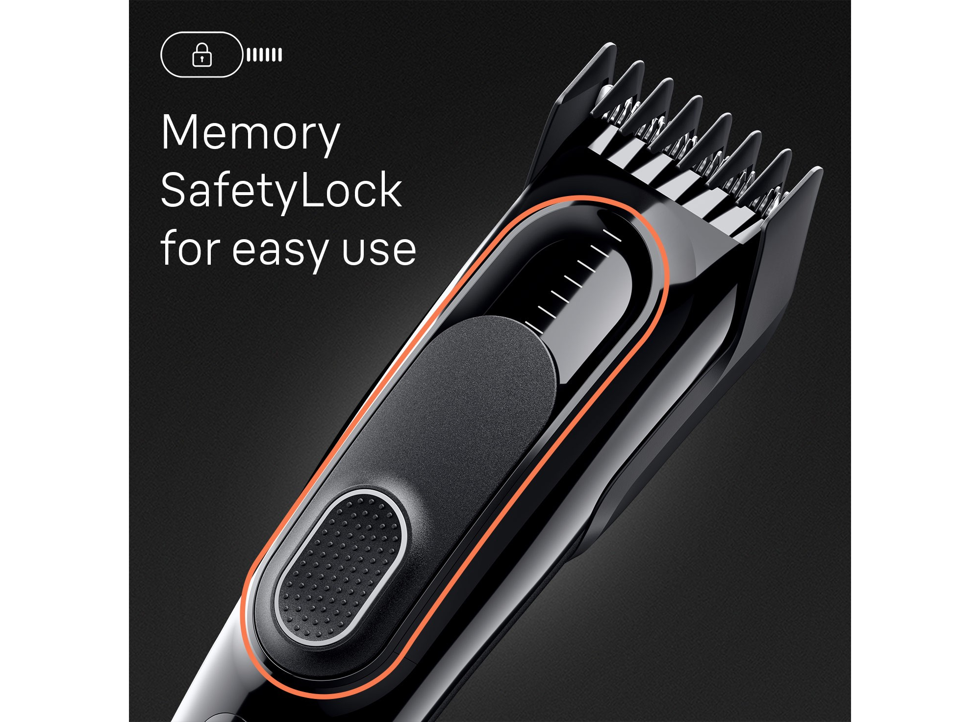 9 длин: с расческой или без • Эргономичная ручка с прорезиненной рукояткой • Устройство можно легко очистить под проточной водой • Создано для разнообразных укладок и станет отличным подарком для мужчин • Memory SafetyLock запоминает и фиксирует последнюю