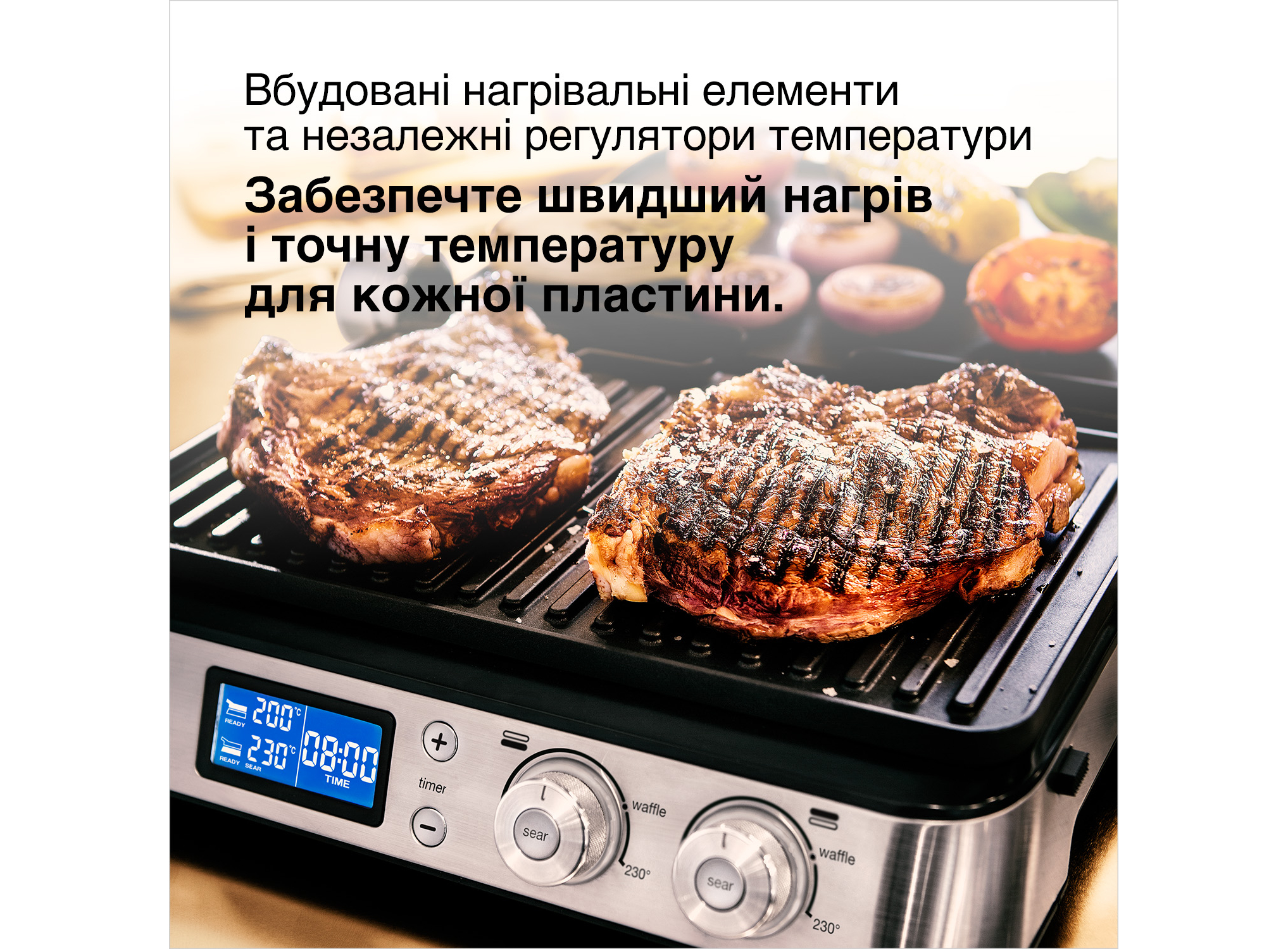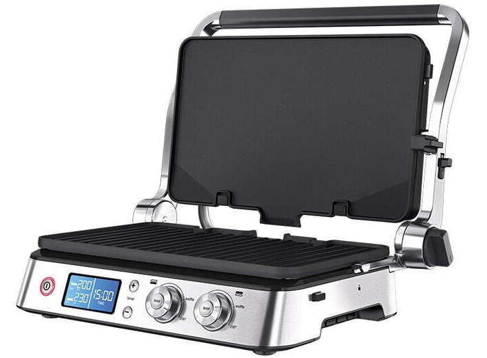 3 режима приготовления: Контактный гриль с рифлеными/плоскими пластинами / Гриль-печь / Открытый гриль с плоскими/рифлеными пластинами • Совмещенный режим • Электронный LED-дисплей (70 х 30 мм) • Функция SEAR («запечатывание» продукта) • Мобильное приложе