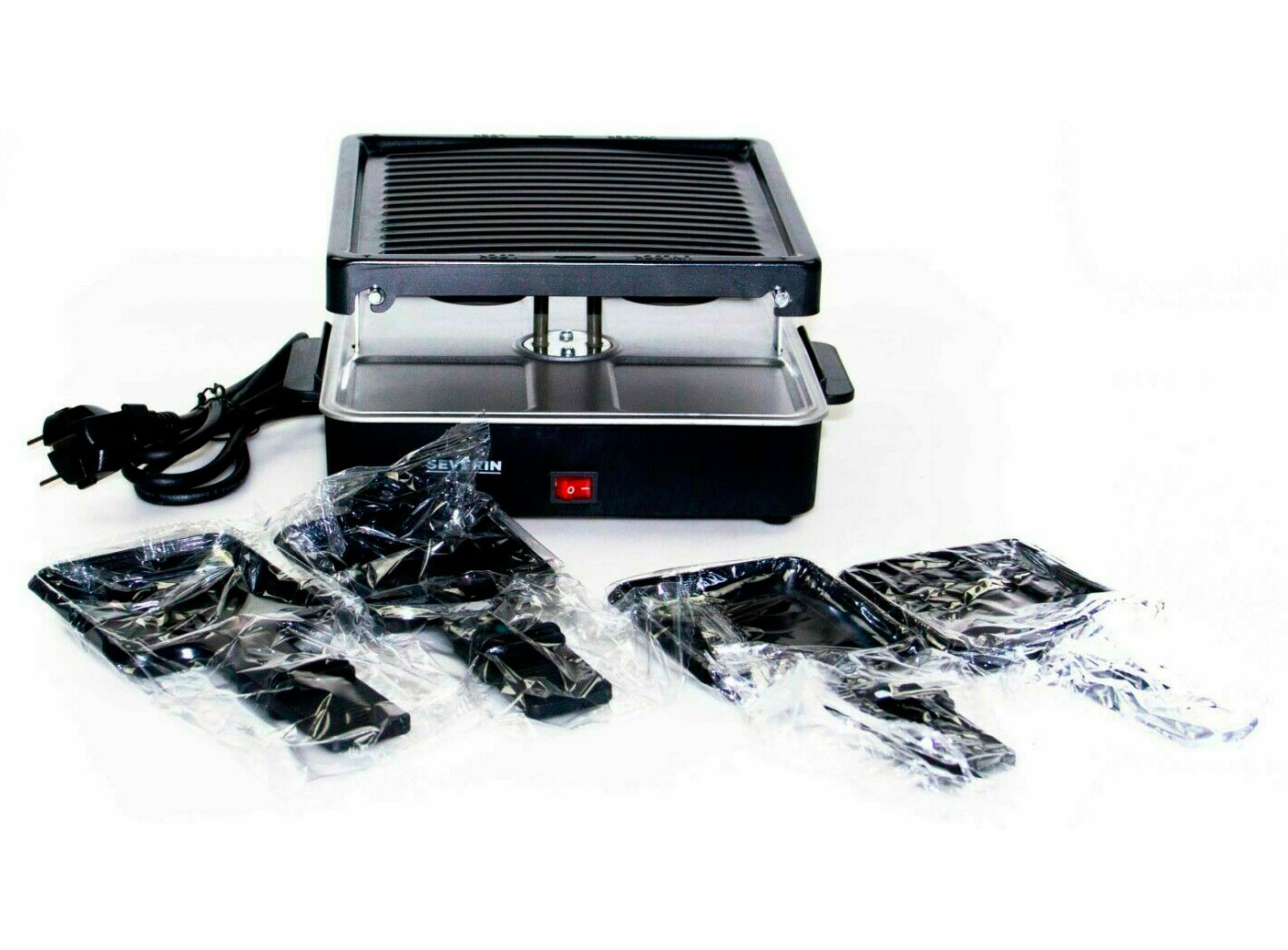 Ребристая пластина для гриля с 4 сковородками для раклет • Высококачественное антипригарное покрытие • Переключатель включения/выключения с индикатором • Нескользящие ножки • Съемные части • Легкая очистка благодаря простой конструкции и/ч ется • Компактн