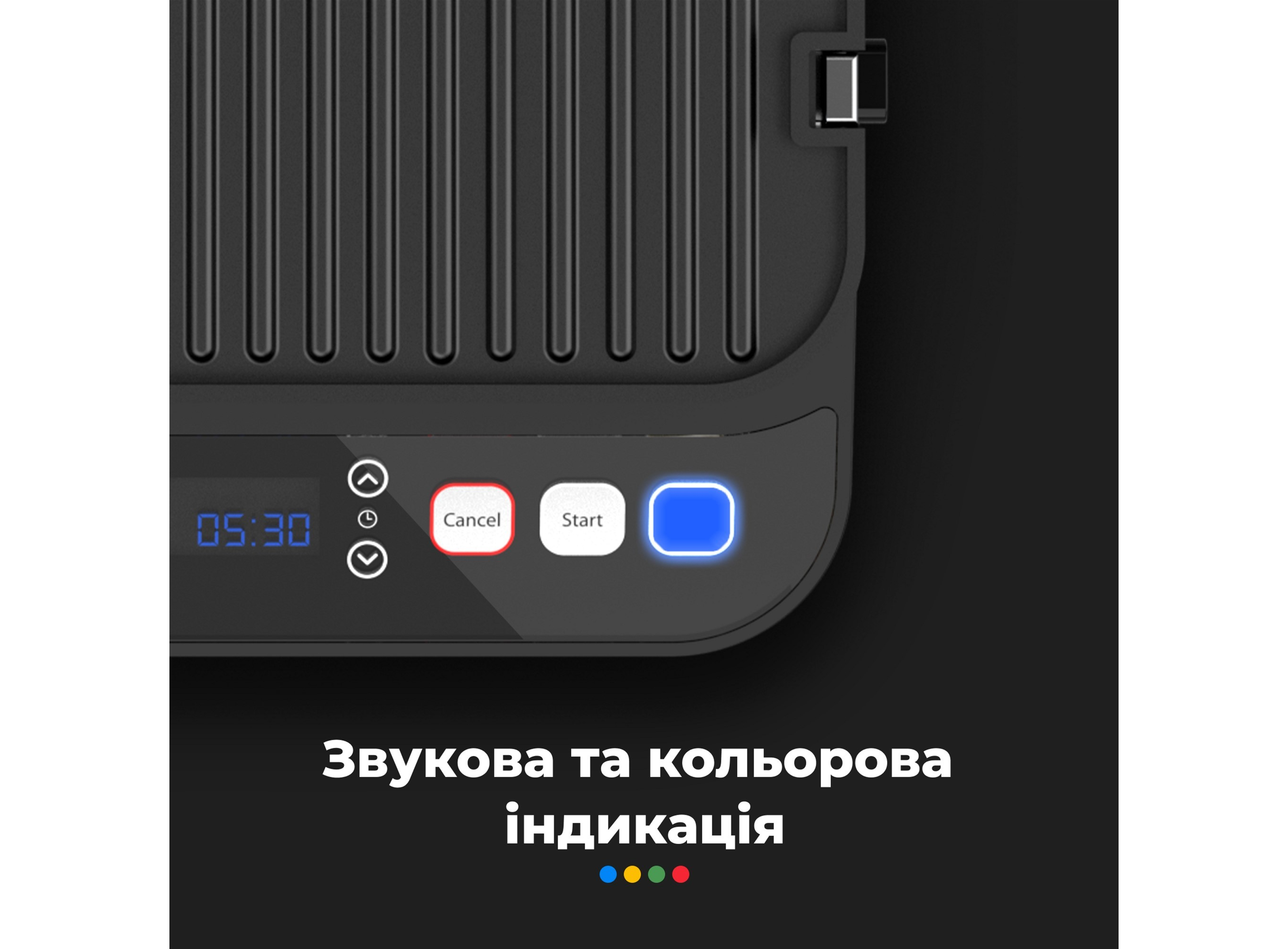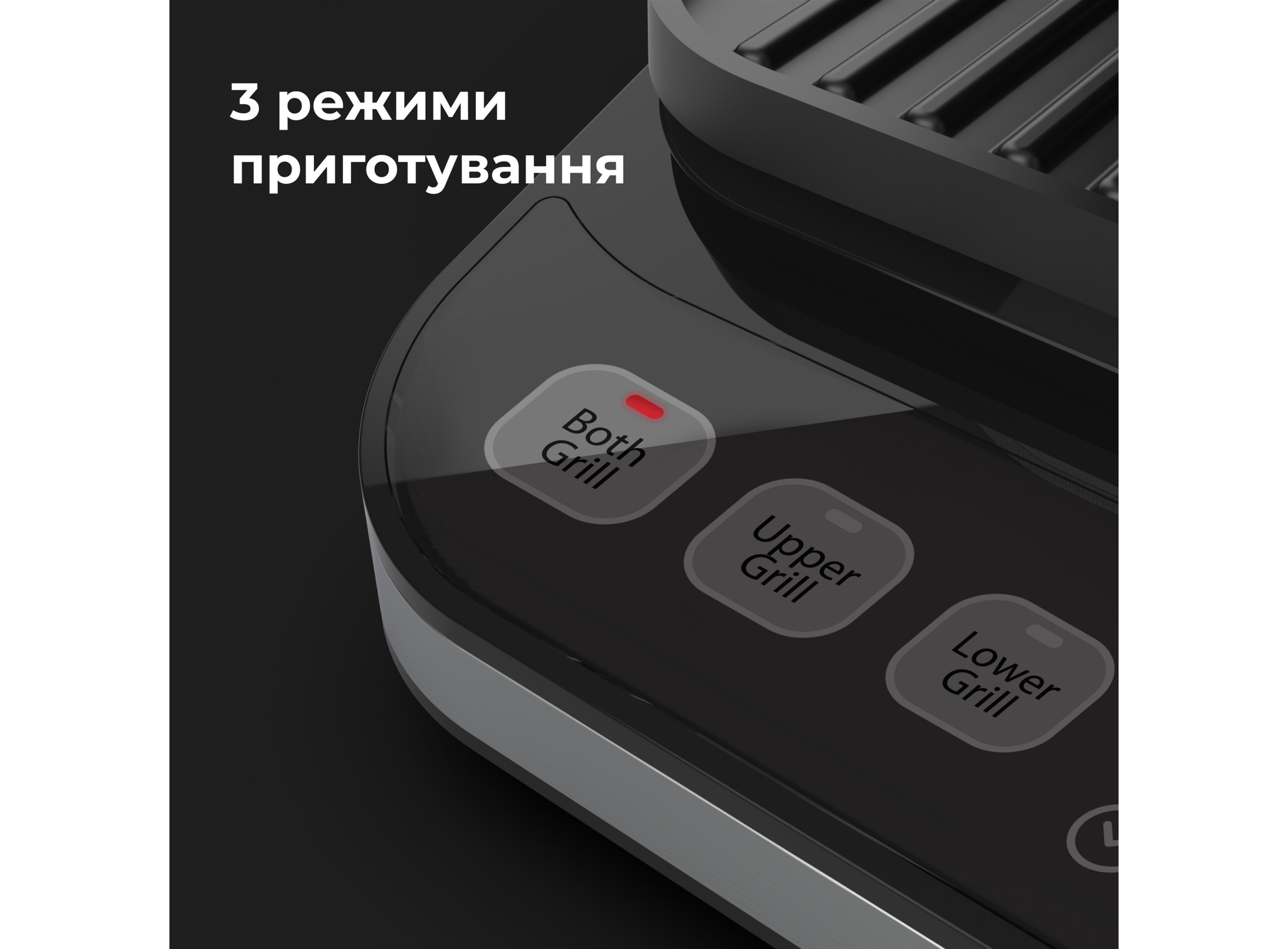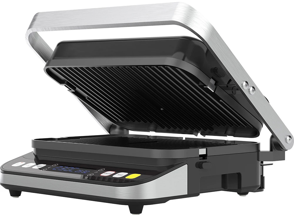 Режимы приготовления: Верхний гриль/Нижний гриль / Верхний+нижний гриль • Регулировка температуры • Регулировка времени • Максимальный угол открытия 180° • Цветовая индикация LED-дисплей • Звуковая индикация • Съемные двусторонние пластины • Ребристая пла