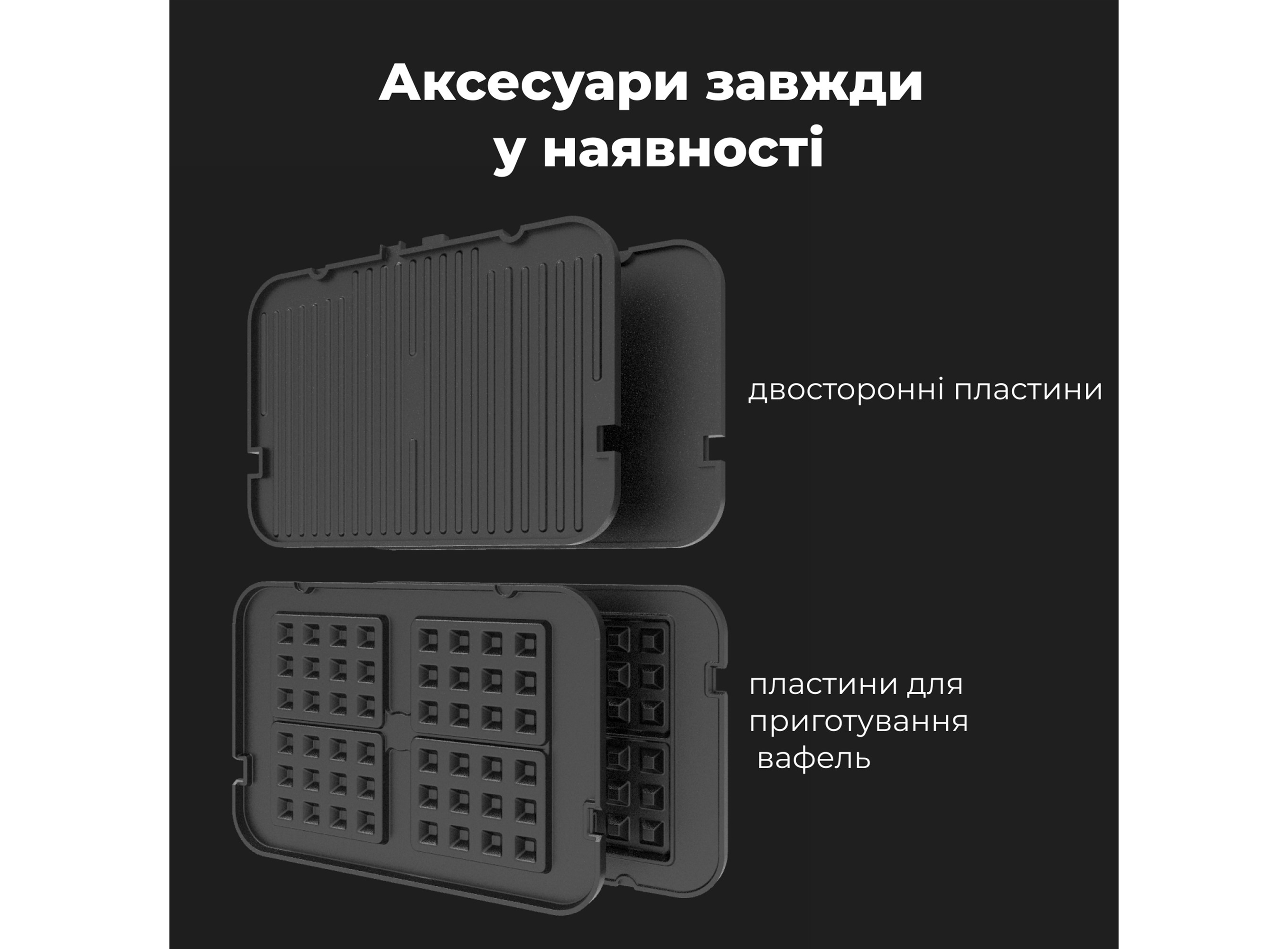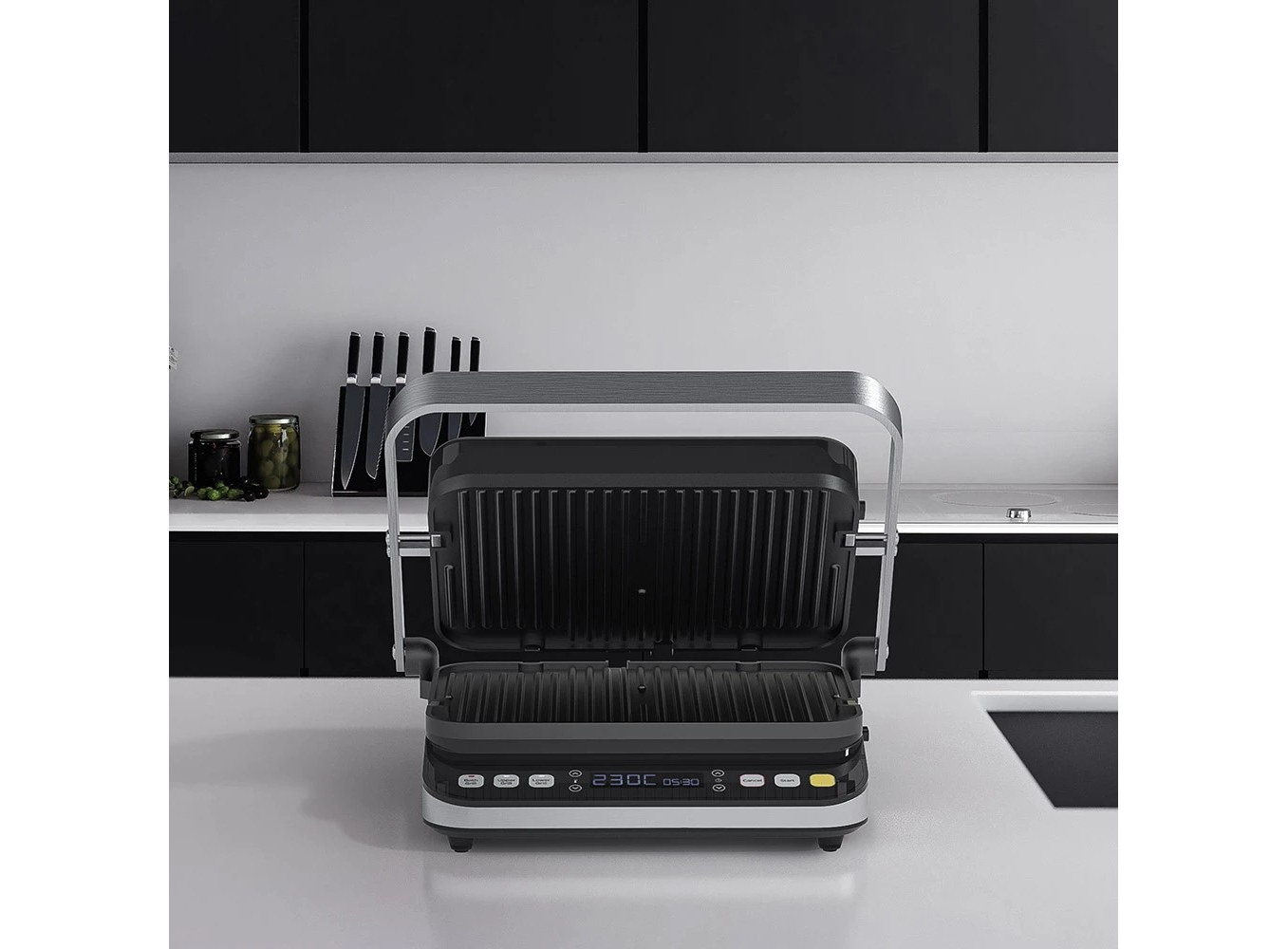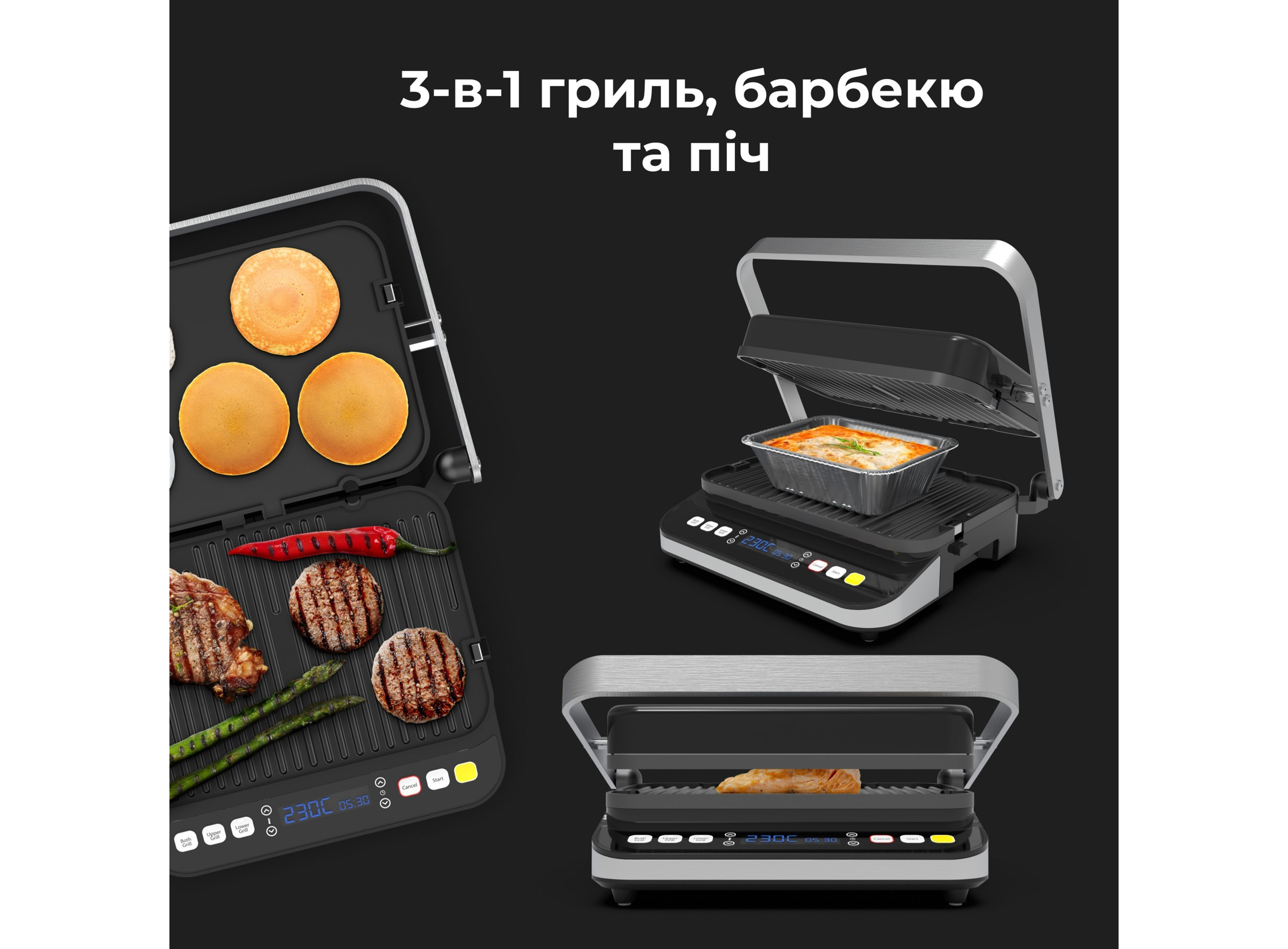 Режимы приготовления: Верхний гриль/Нижний гриль / Верхний+нижний гриль • Регулировка температуры • Регулировка времени • Максимальный угол открытия 180° • Цветовая индикация LED-дисплей • Звуковая индикация • Съемные двусторонние пластины • Ребристая пла