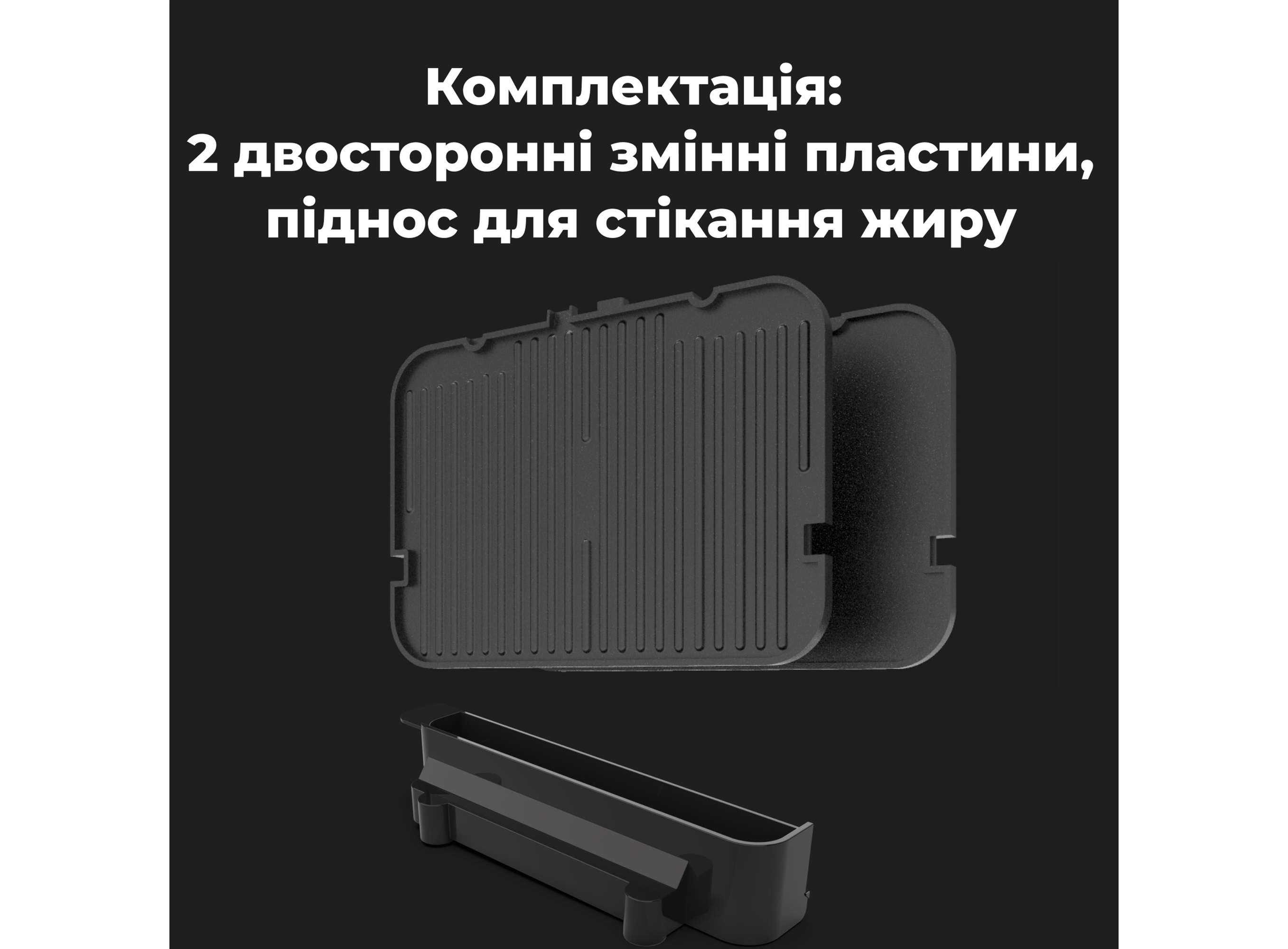 Гриль • Съемные двусторонние панели (2 шт.) • Пластиковый поддон для сбора жира • Краткое руководство • Гарантийный талон • Электронная книга рецептов • Эко упаковка