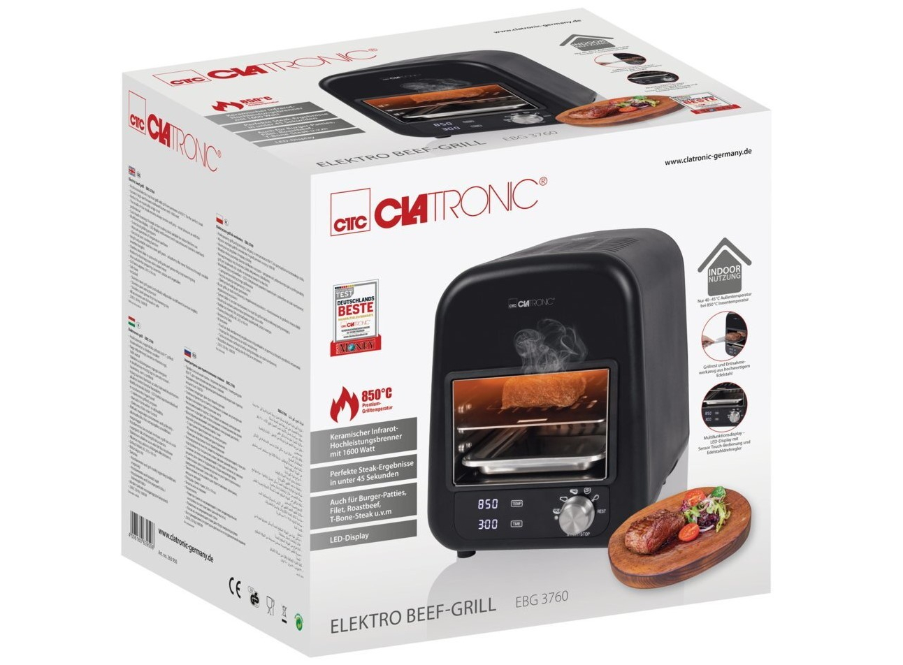 Электрический гриль Clatronic EBG 3760 • Решетка для гриля из нержавеющей стали (с индивидуальной регулировкой с разной высотой вставки) • Инструмент для чистки нержавеющей стали • Поддон для капель • Инструкция