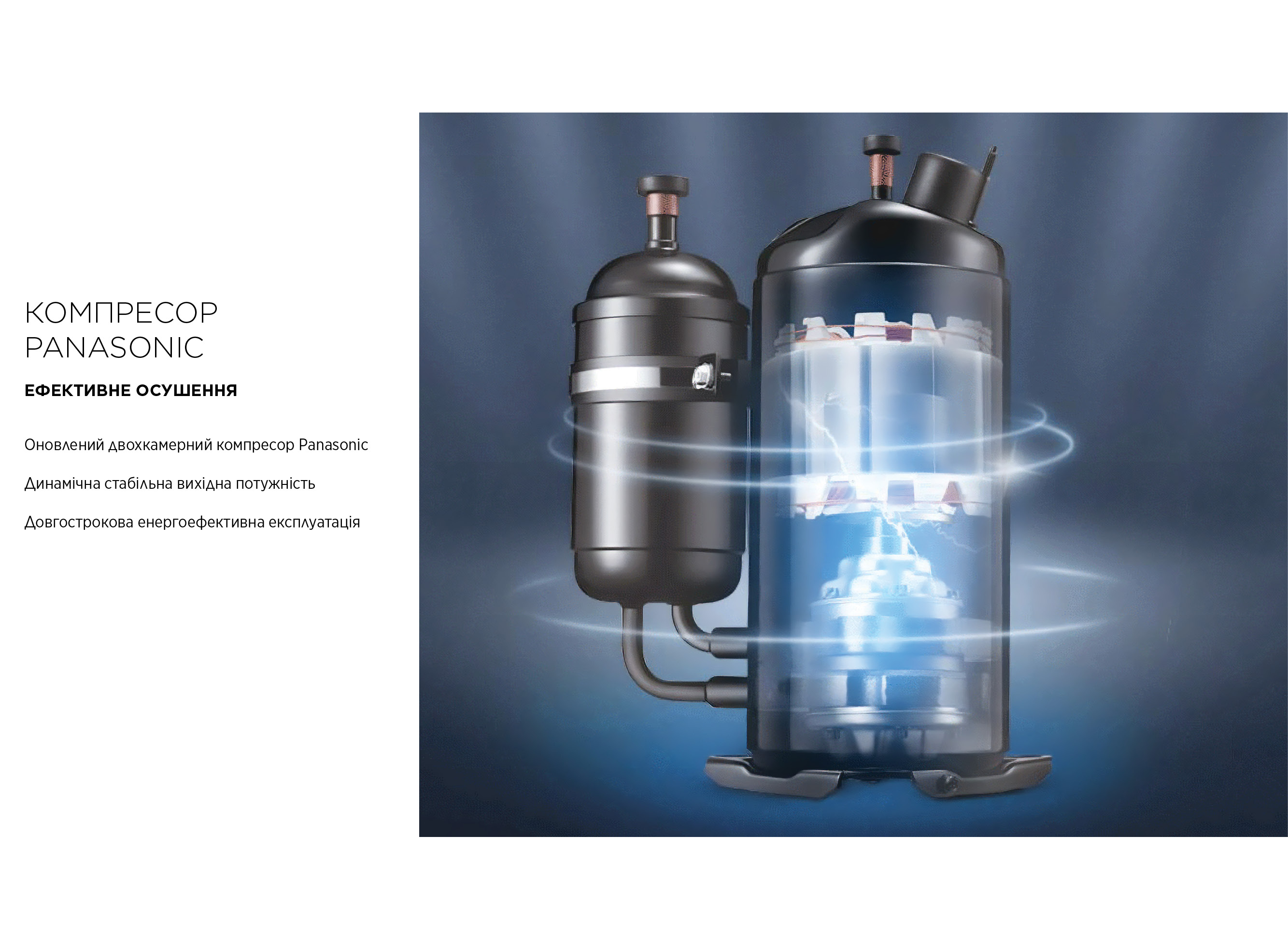 Электронное управление • Ионизатор воздуха • 4 режима работы: непрерывный, комфортный, заданный, сушка одежды • Установка и поддержание влажности от 40% до 70% • Две скорости вентилятора: максимальная, минимальная