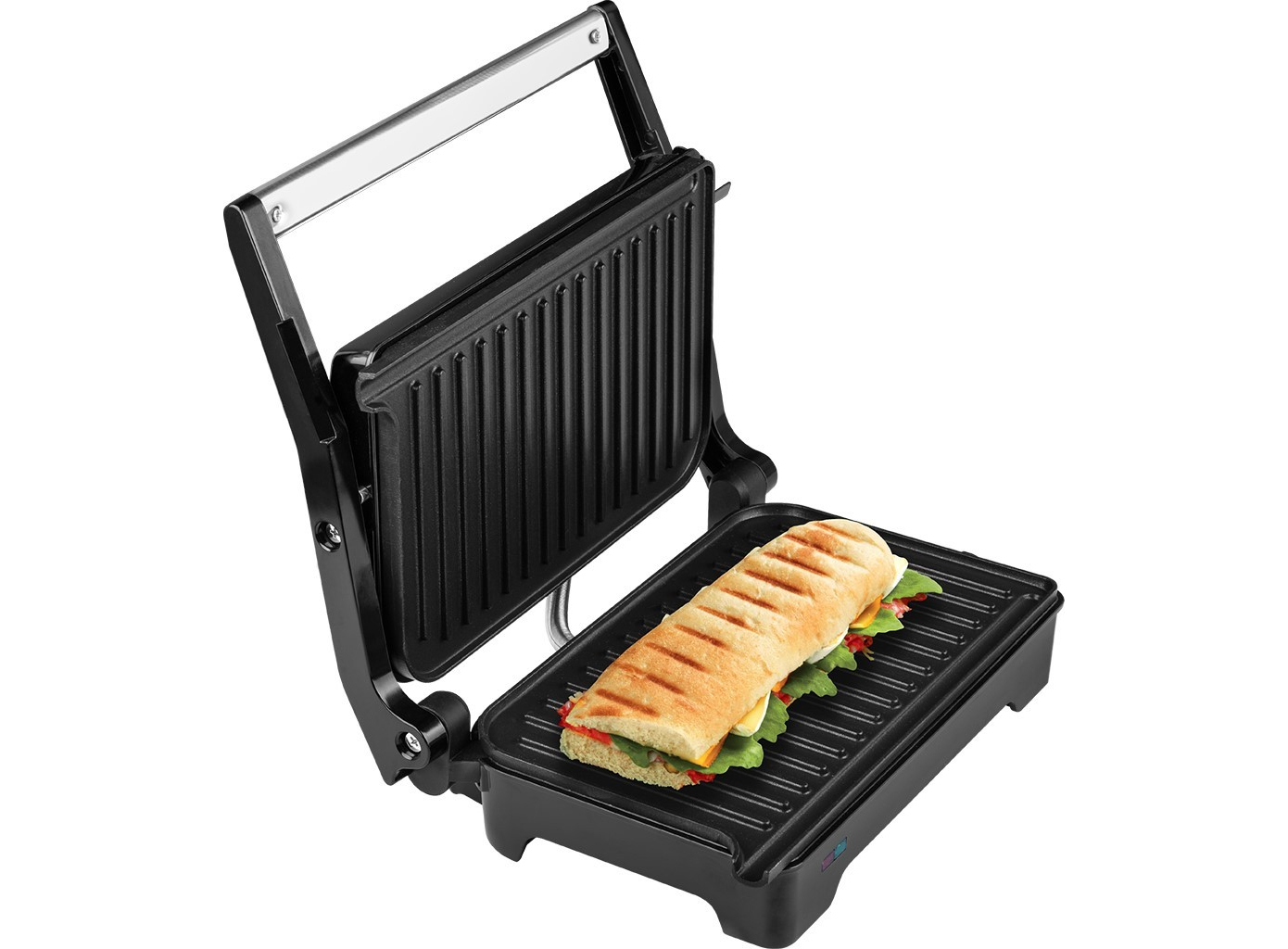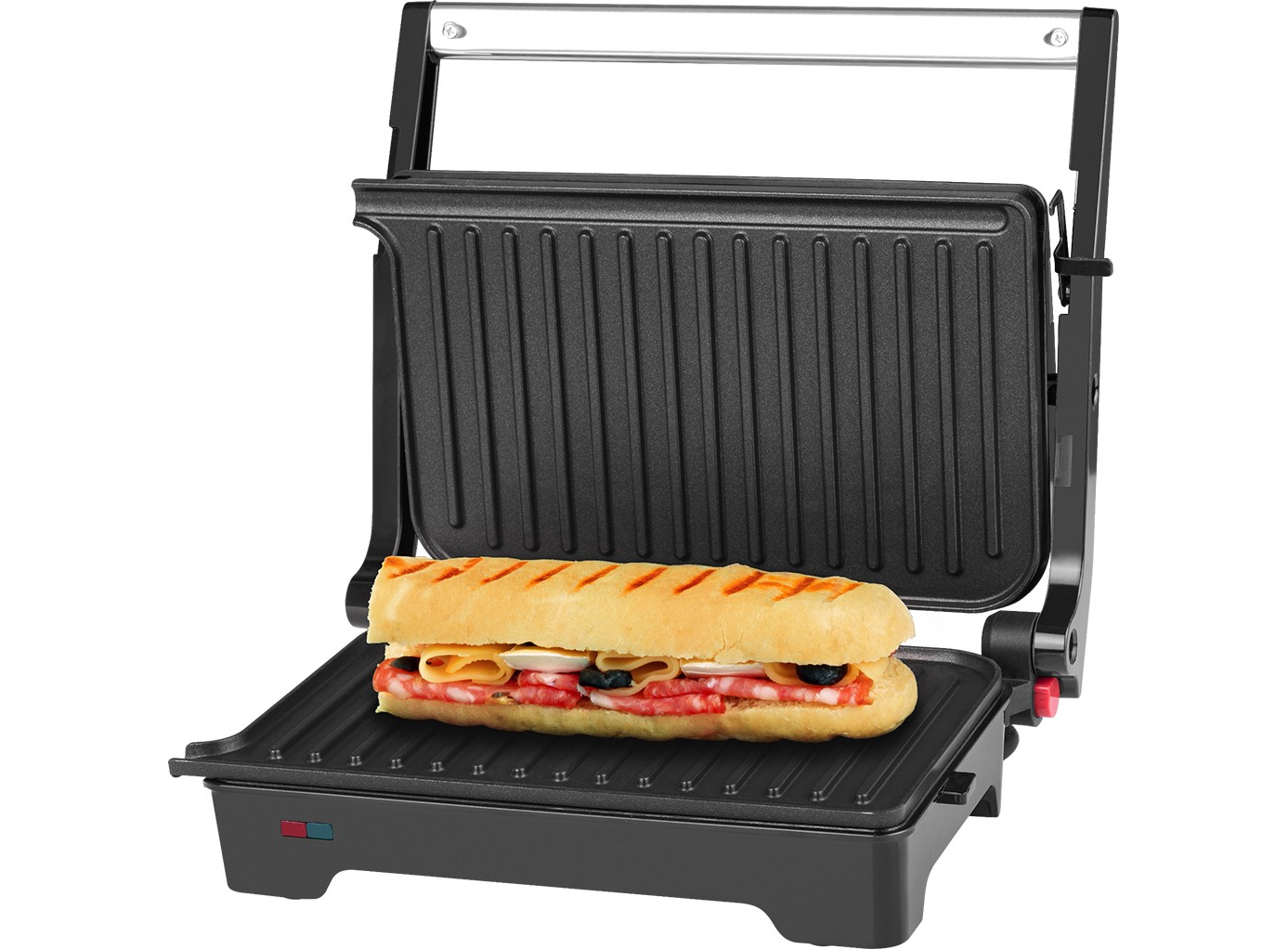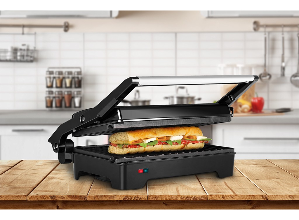 Подходит для приготовления панини, тостов, мяса, рыбы и овощей • Простой уход благодаря антипригарному покрытию рабочих поверхностей • Возможность полного открывания на угол 180° • Блокировка нагревательных пластин • Автоматическое регулирование температу