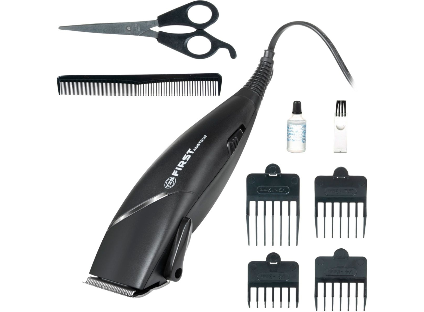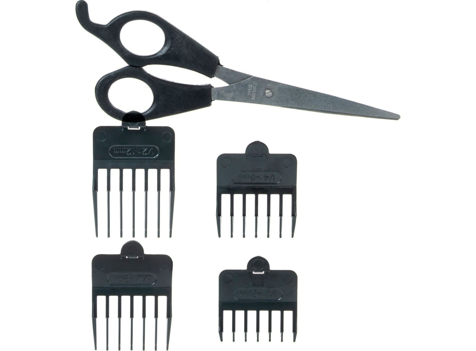 Машинка для стрижки • Насадки (4 шт) • Расческа • Ножницы • Щетка для чистки • Масленка