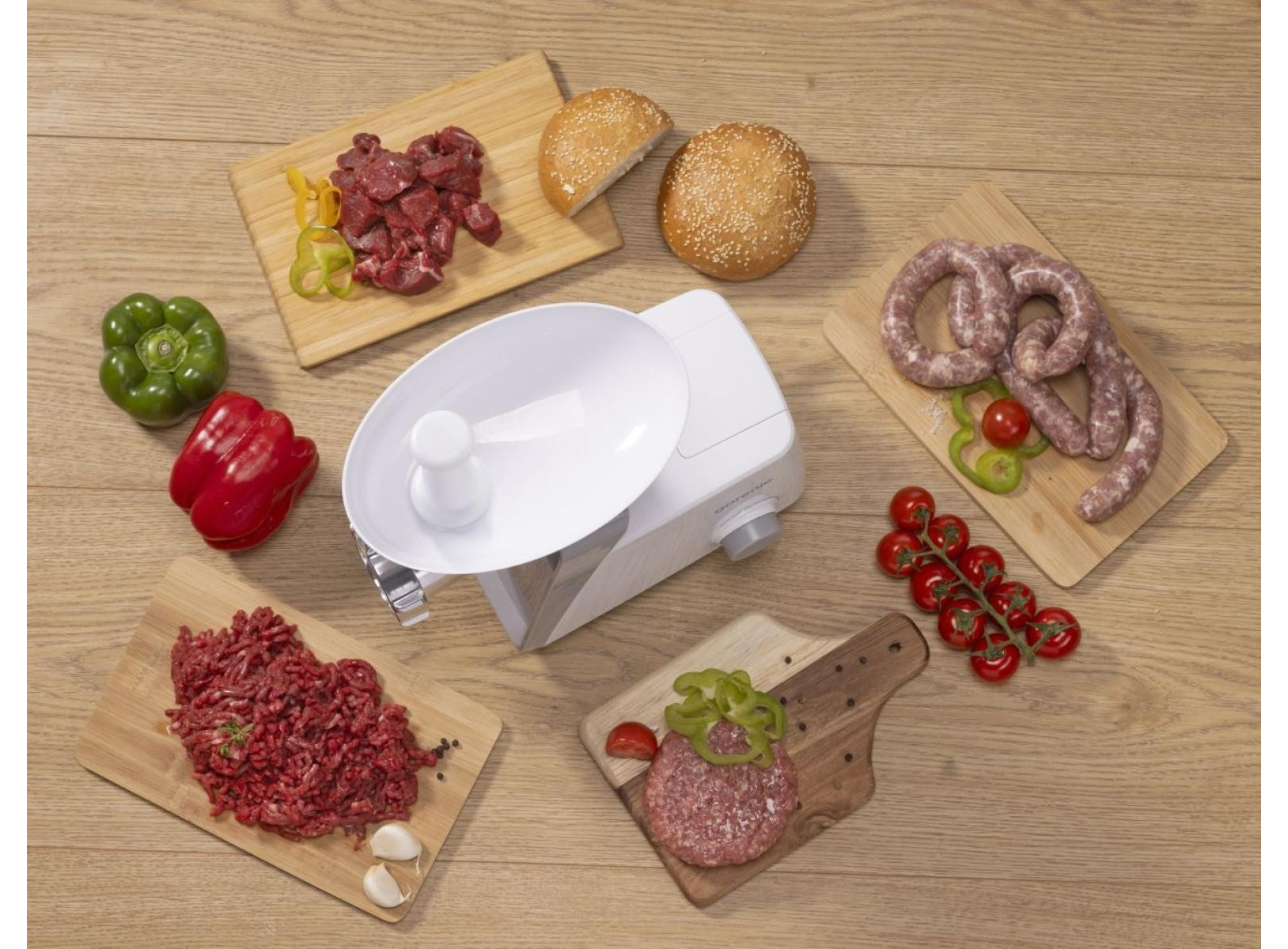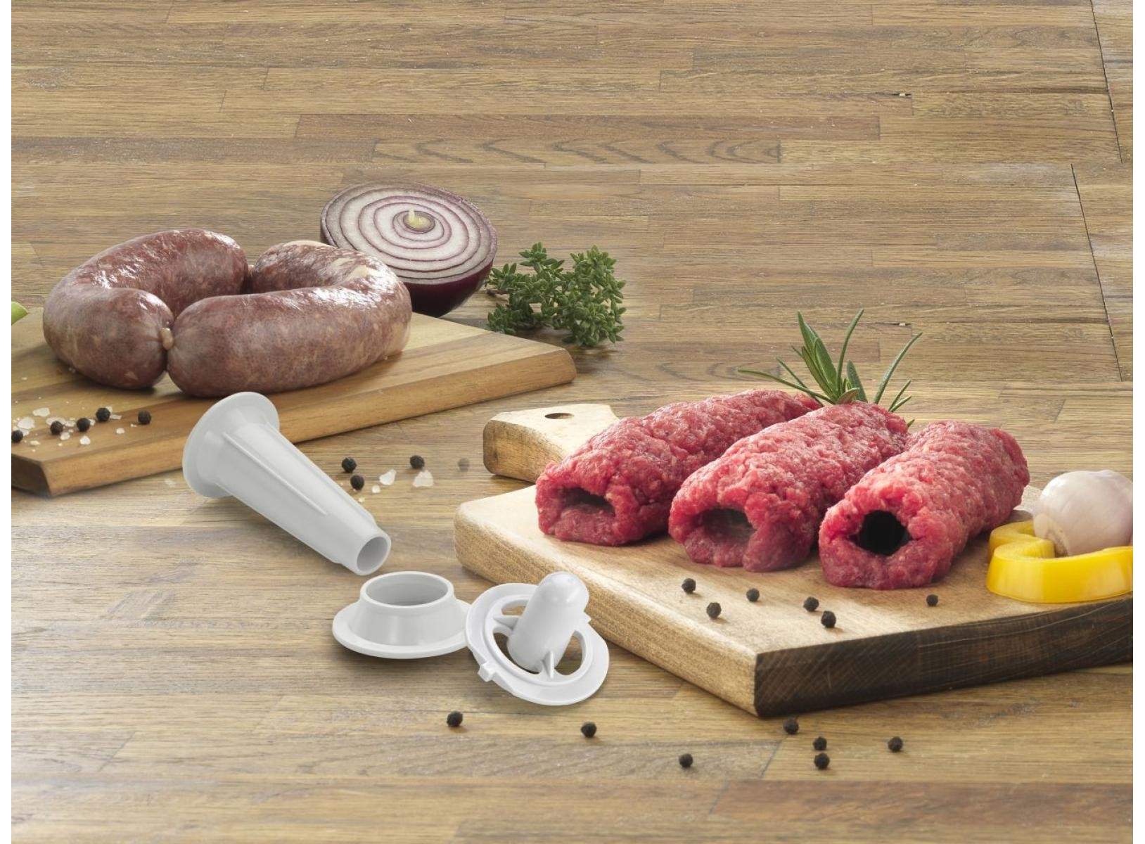 Мясорубка • Металлические диски для приготовления фарша – 2 шт. • Толкатель • Насадка для колбасок • Насадка для киббеха • Резиновые ножки • Инструкция • Гарантийный талон