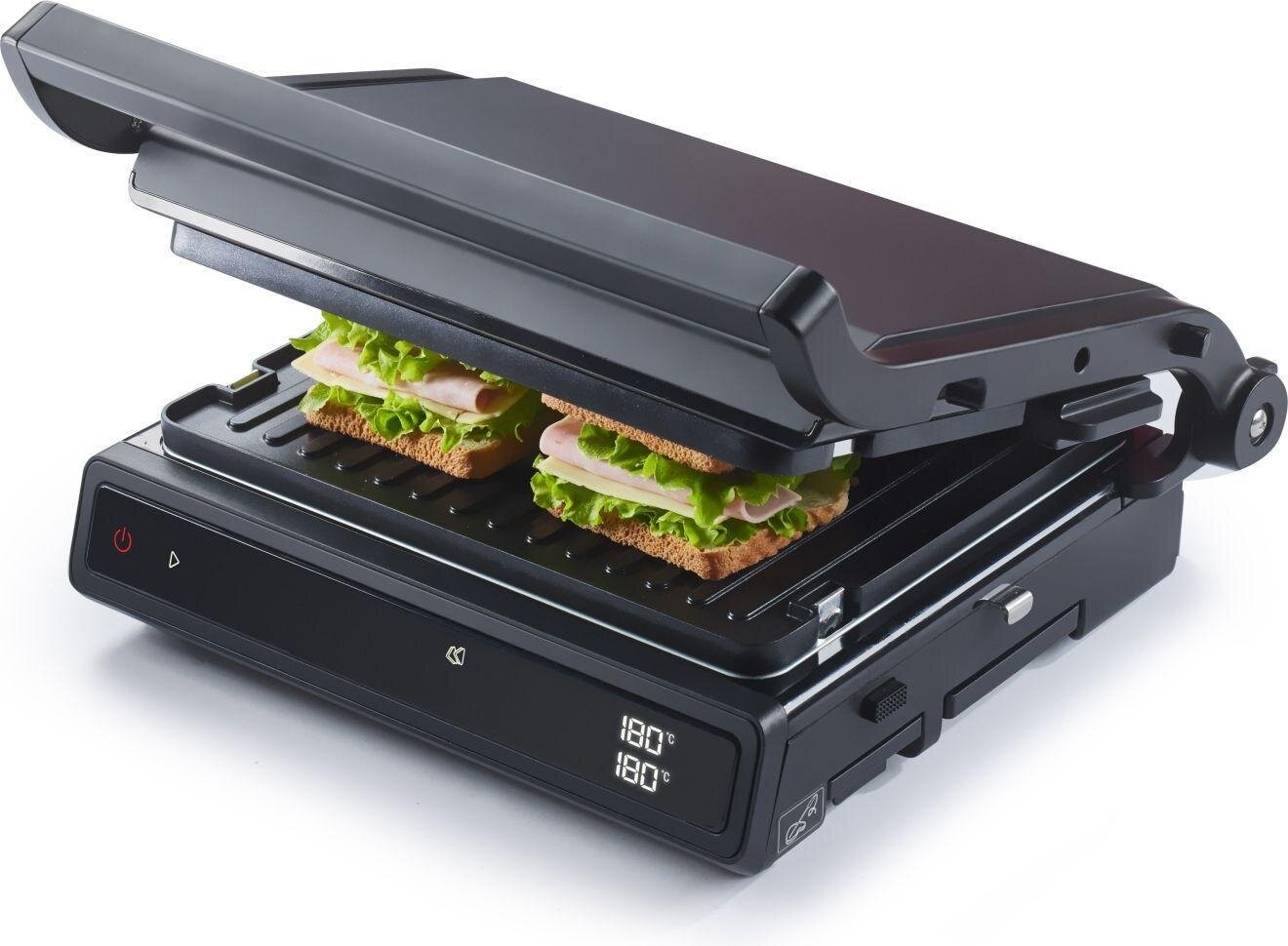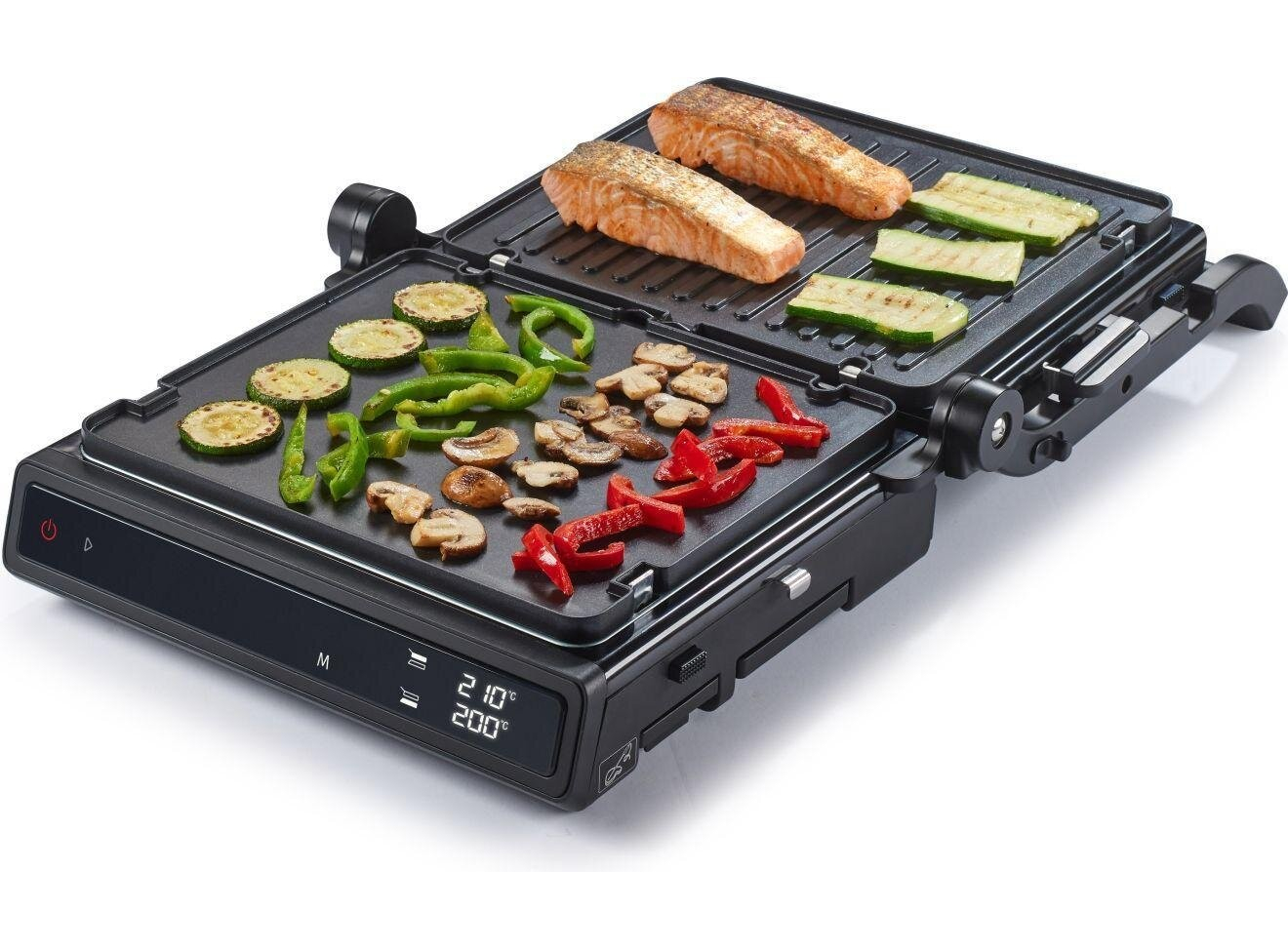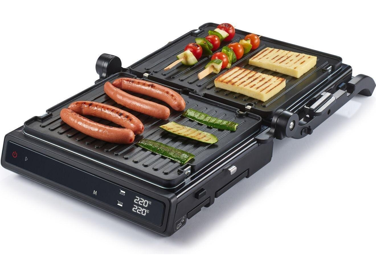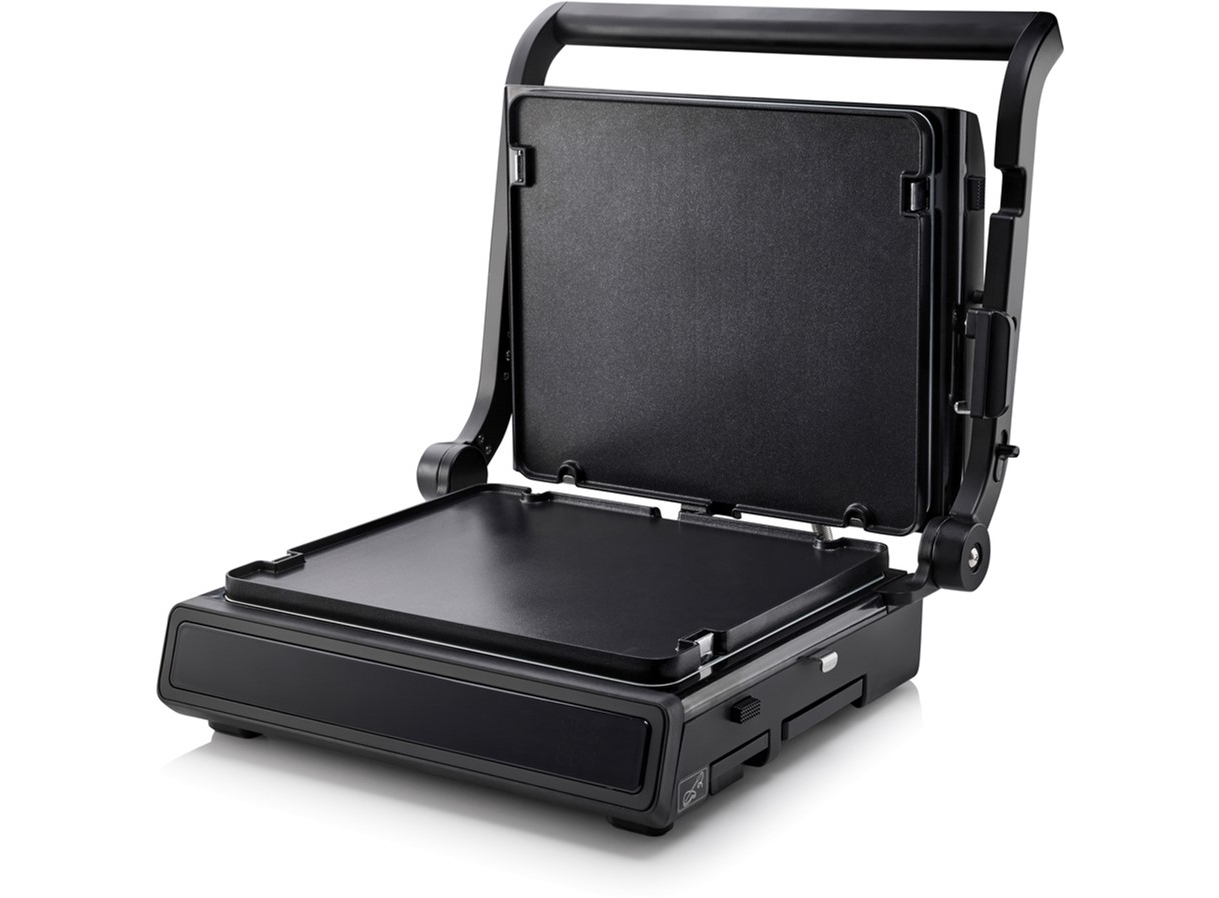 Двусторонняя поверхность • Противопригарное покрытие пластин • Грилевые пластины - гофрированная рабочая поверхность, гладкая поверхность • Возможность регулировки высоты 11 предварительно установленных программ • Белый индикатор работы • Защитная защелка