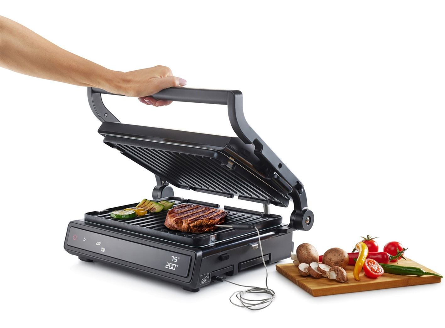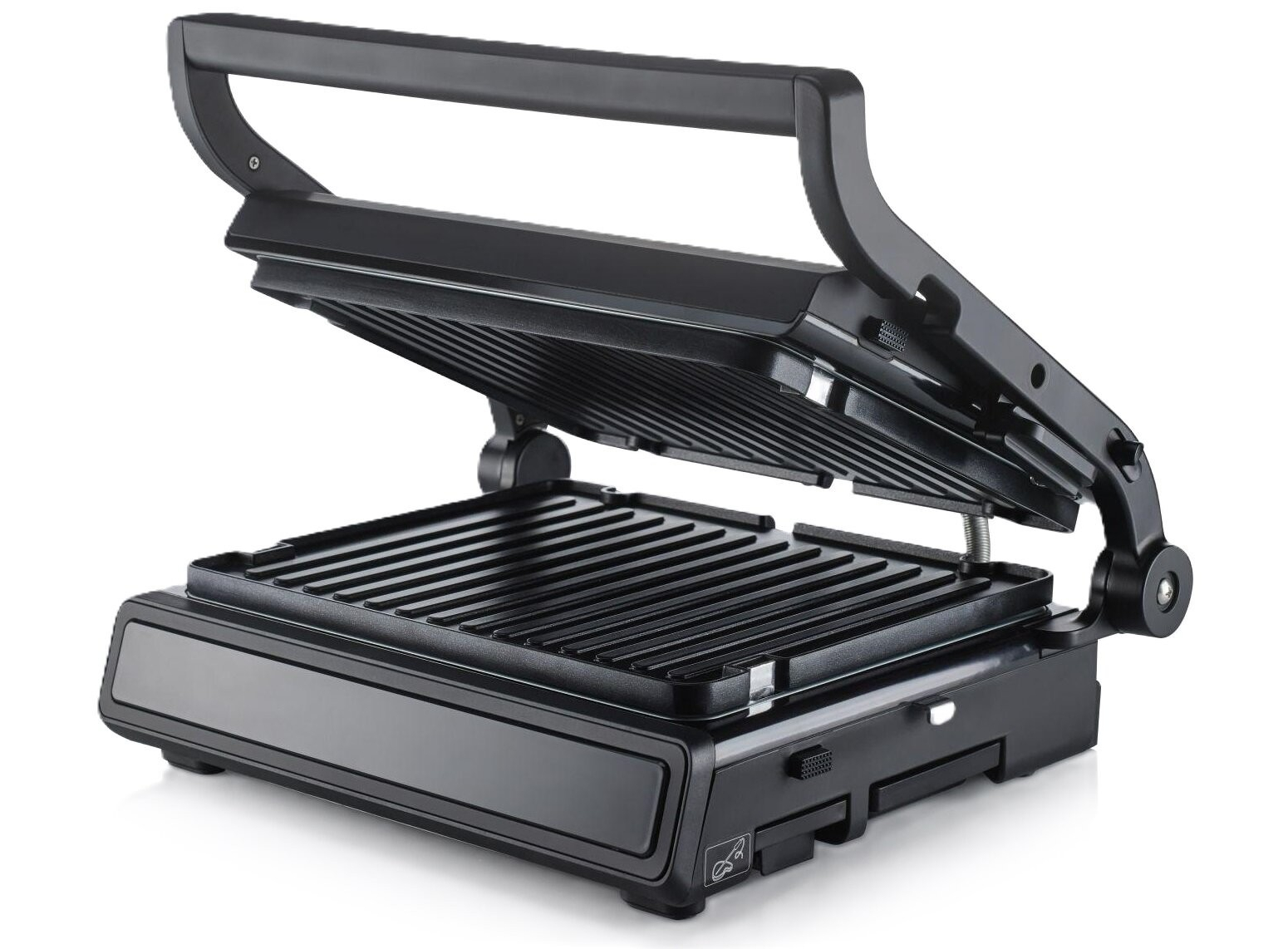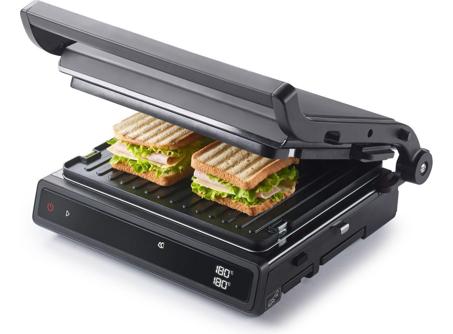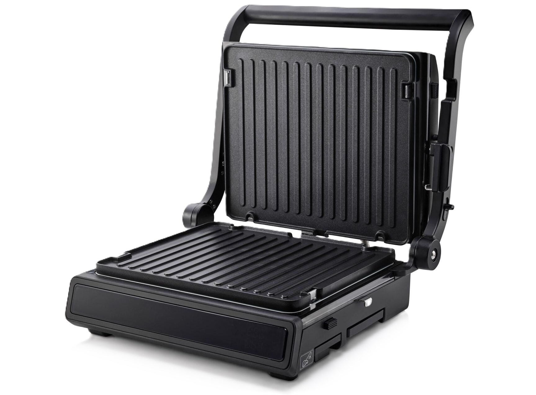 Двусторонняя поверхность • Противопригарное покрытие пластин • Грилевые пластины - гофрированная рабочая поверхность, гладкая поверхность • Возможность регулировки высоты 11 предварительно установленных программ • Белый индикатор работы • Защитная защелка