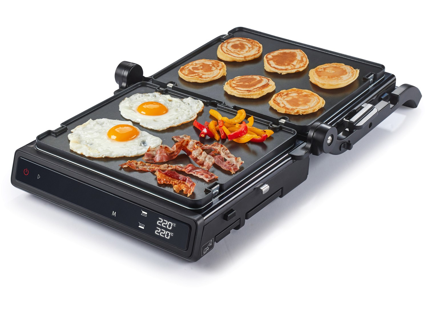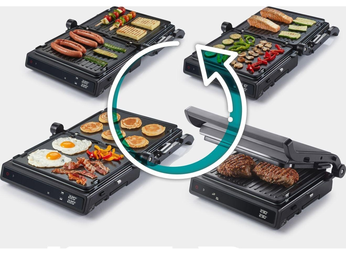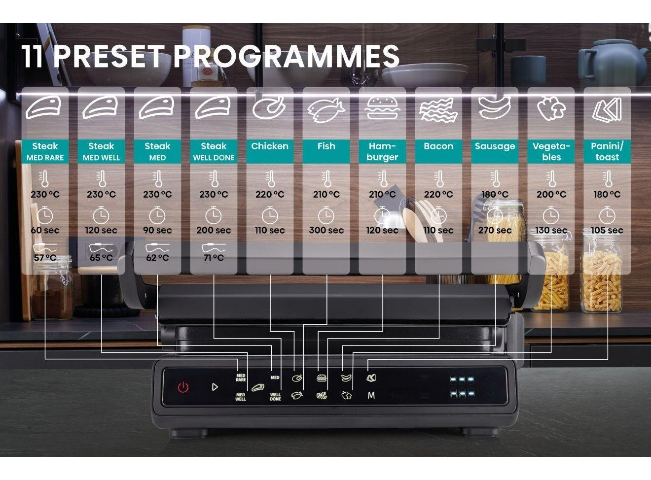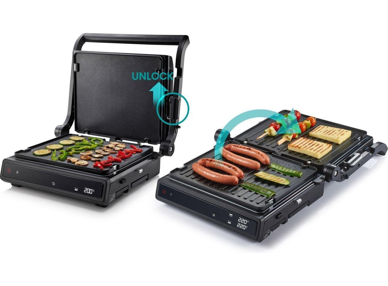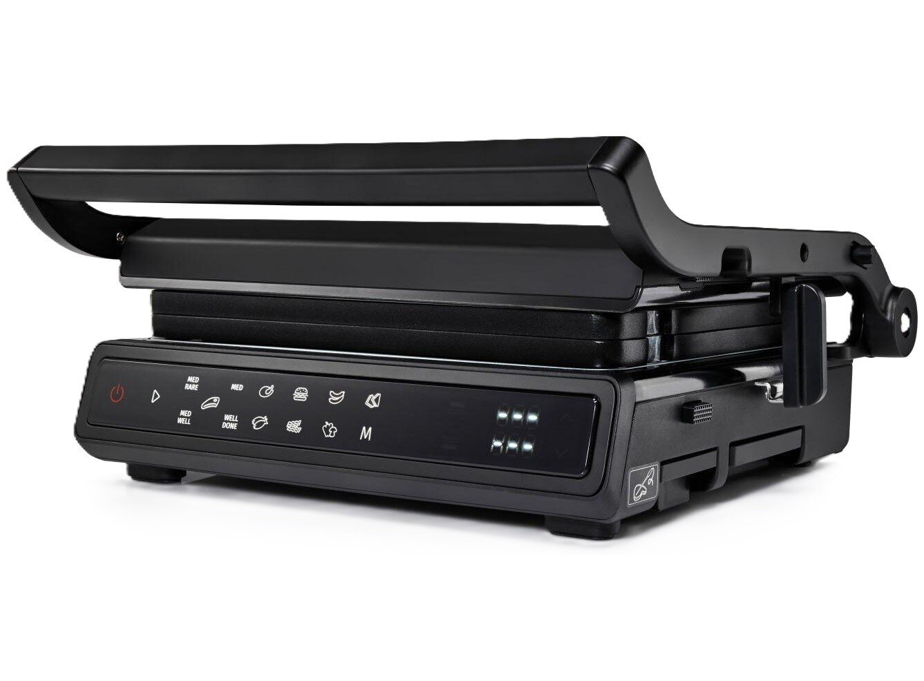 Двусторонняя поверхность • Противопригарное покрытие пластин • Грилевые пластины - гофрированная рабочая поверхность, гладкая поверхность • Возможность регулировки высоты 11 предварительно установленных программ • Белый индикатор работы • Защитная защелка