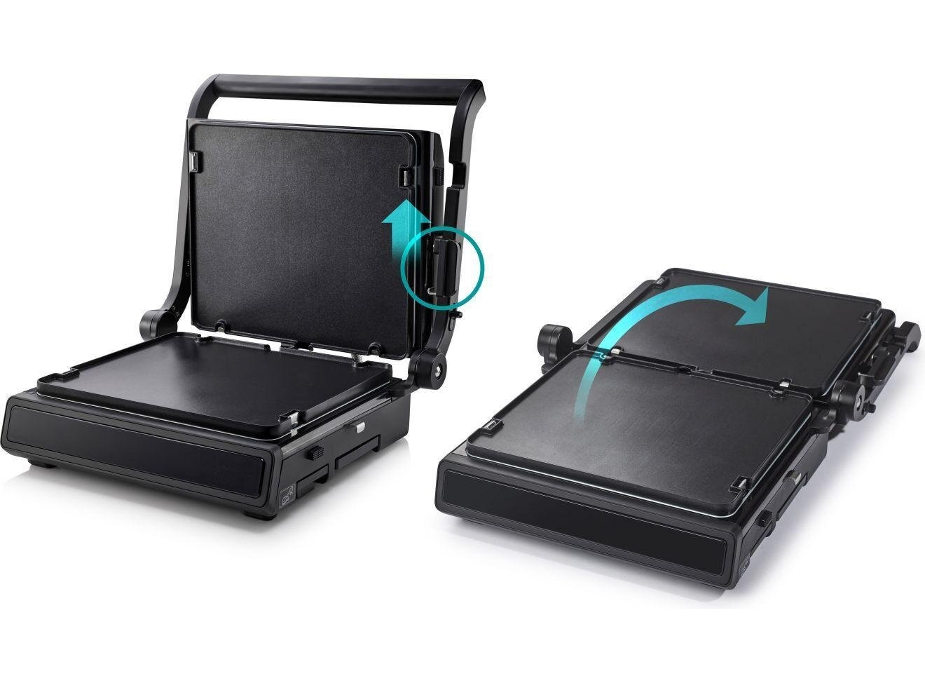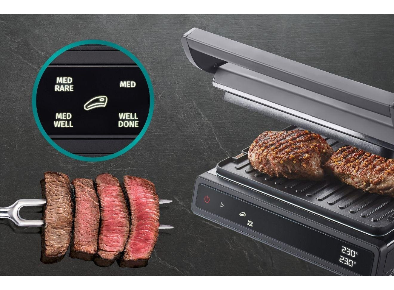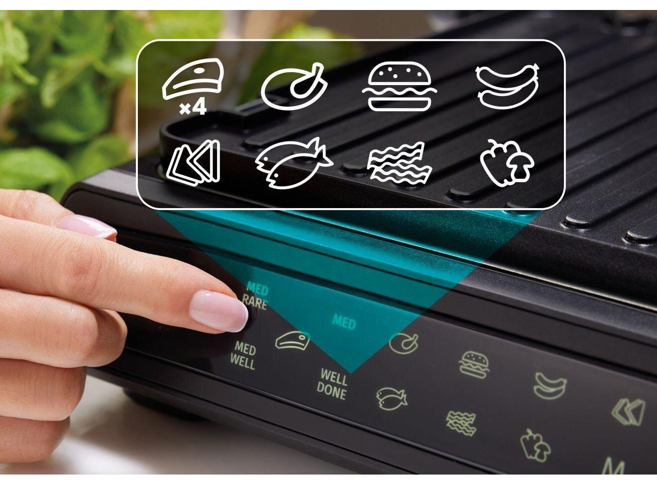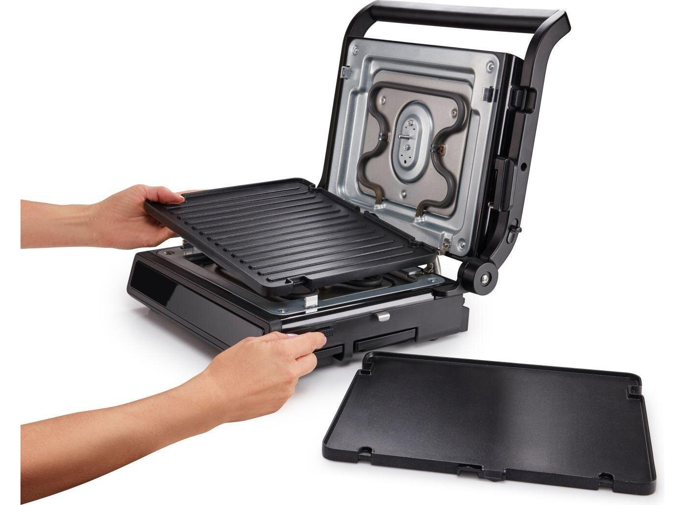 Двусторонняя поверхность • Противопригарное покрытие пластин • Грилевые пластины - гофрированная рабочая поверхность, гладкая поверхность • Возможность регулировки высоты 11 предварительно установленных программ • Белый индикатор работы • Защитная защелка