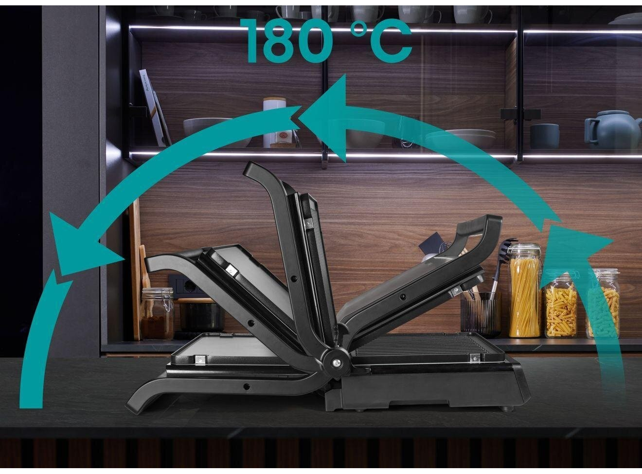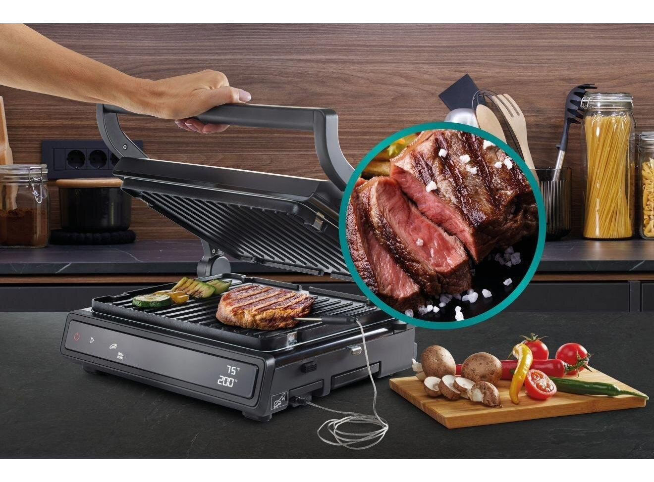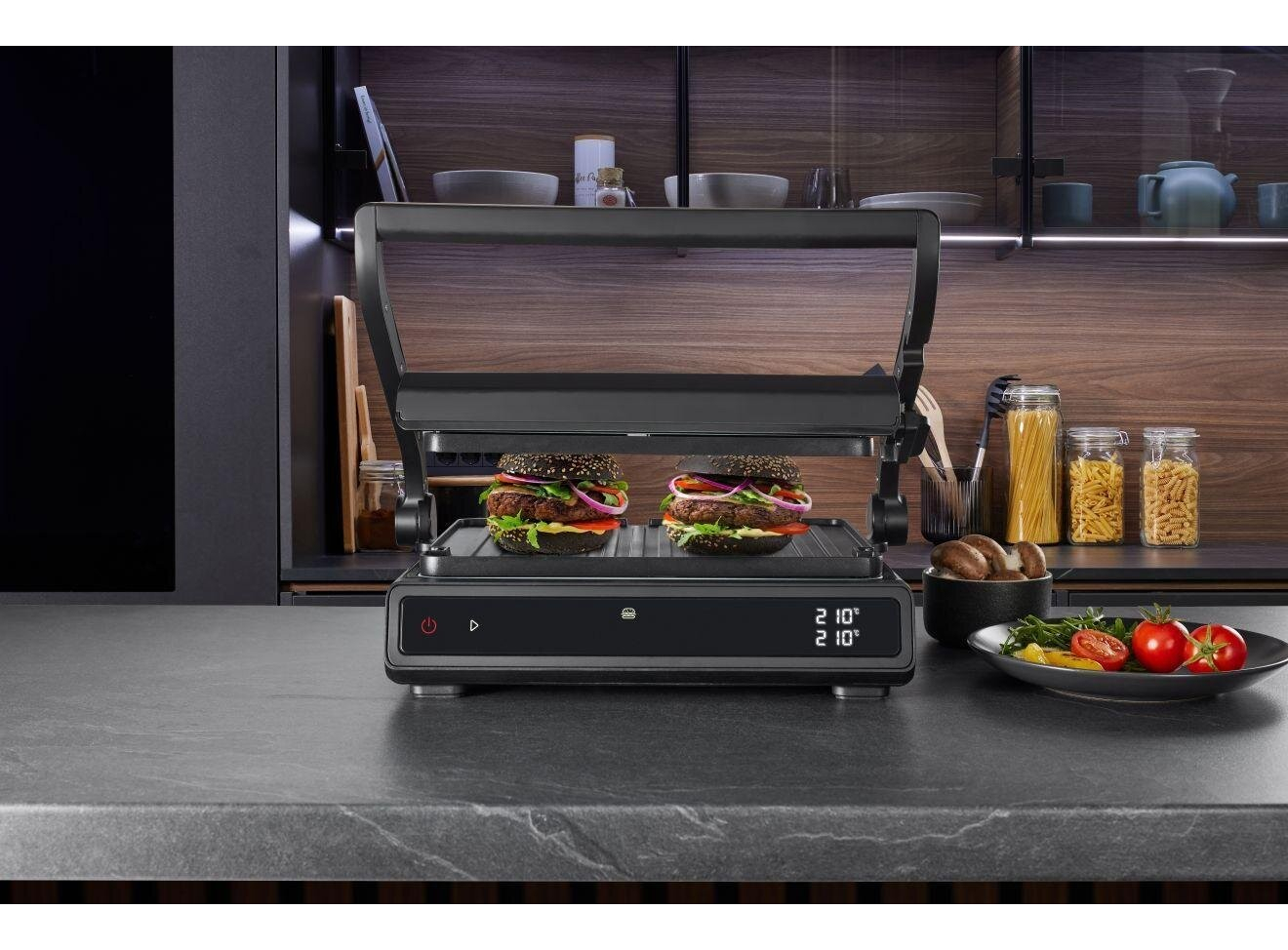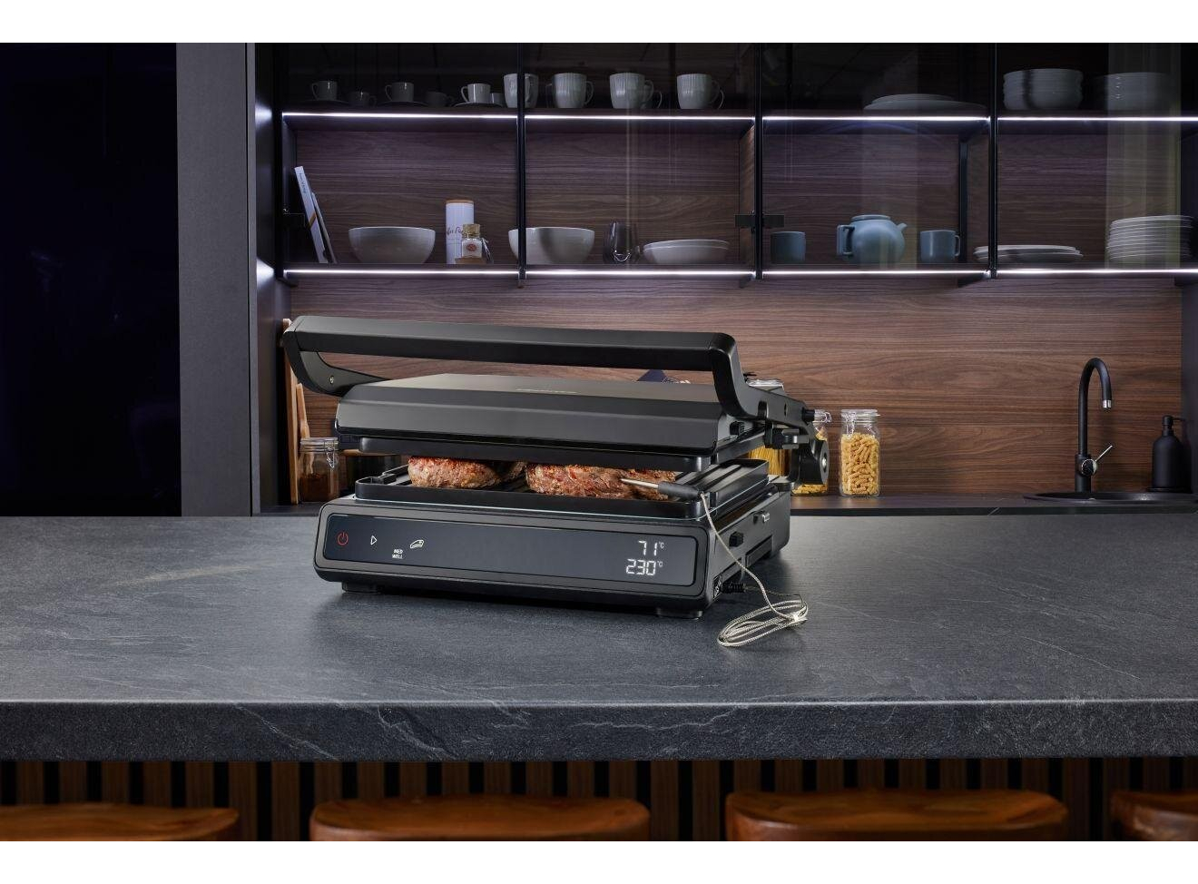 Двусторонняя поверхность • Противопригарное покрытие пластин • Грилевые пластины - гофрированная рабочая поверхность, гладкая поверхность • Возможность регулировки высоты 11 предварительно установленных программ • Белый индикатор работы • Защитная защелка