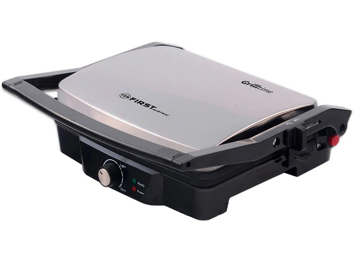 Теплоизолированный корпус с крышкой из нержавеющей стали • 3 режима эксплуатации: закрытый, открытый на 90°, открытый на 180° • 2 рифленые платформы с антипригарным покрытием, обеспечивающих равномерный нагрев и поджаривание с обеих сторон • Плавная регул