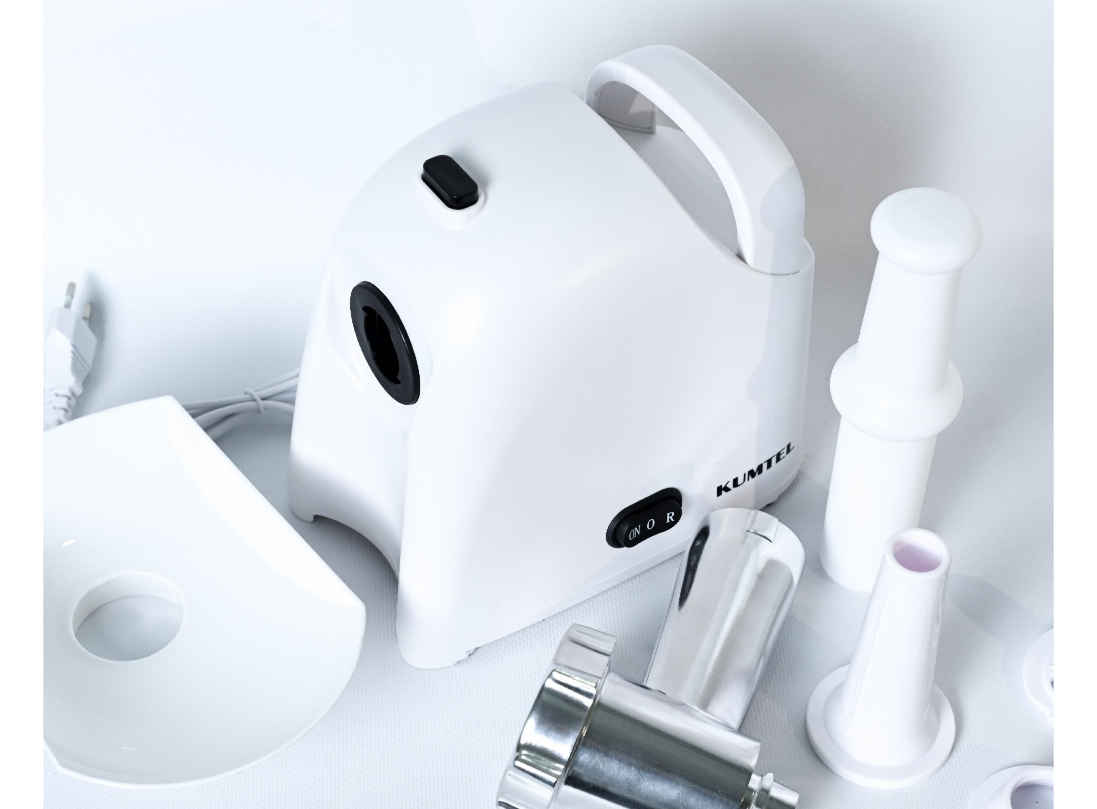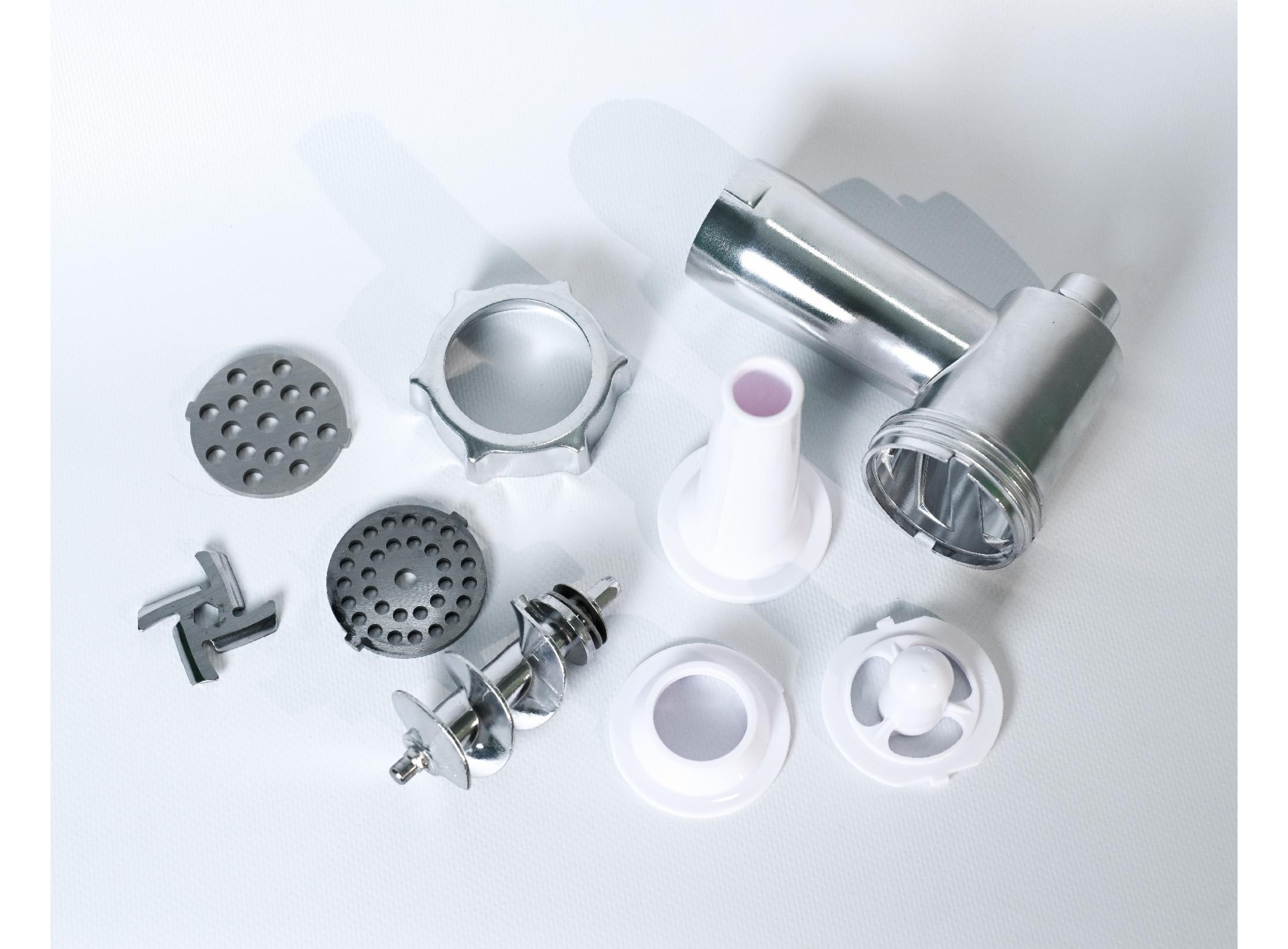 2 сита 5; 7 мм • Насадки: для колбасы, для изготовления пашт.етов • Металлическая камера для помола • Нескользящие ножки • Система защиты двигателя • Нож из нержавеющей стали • Толкатель