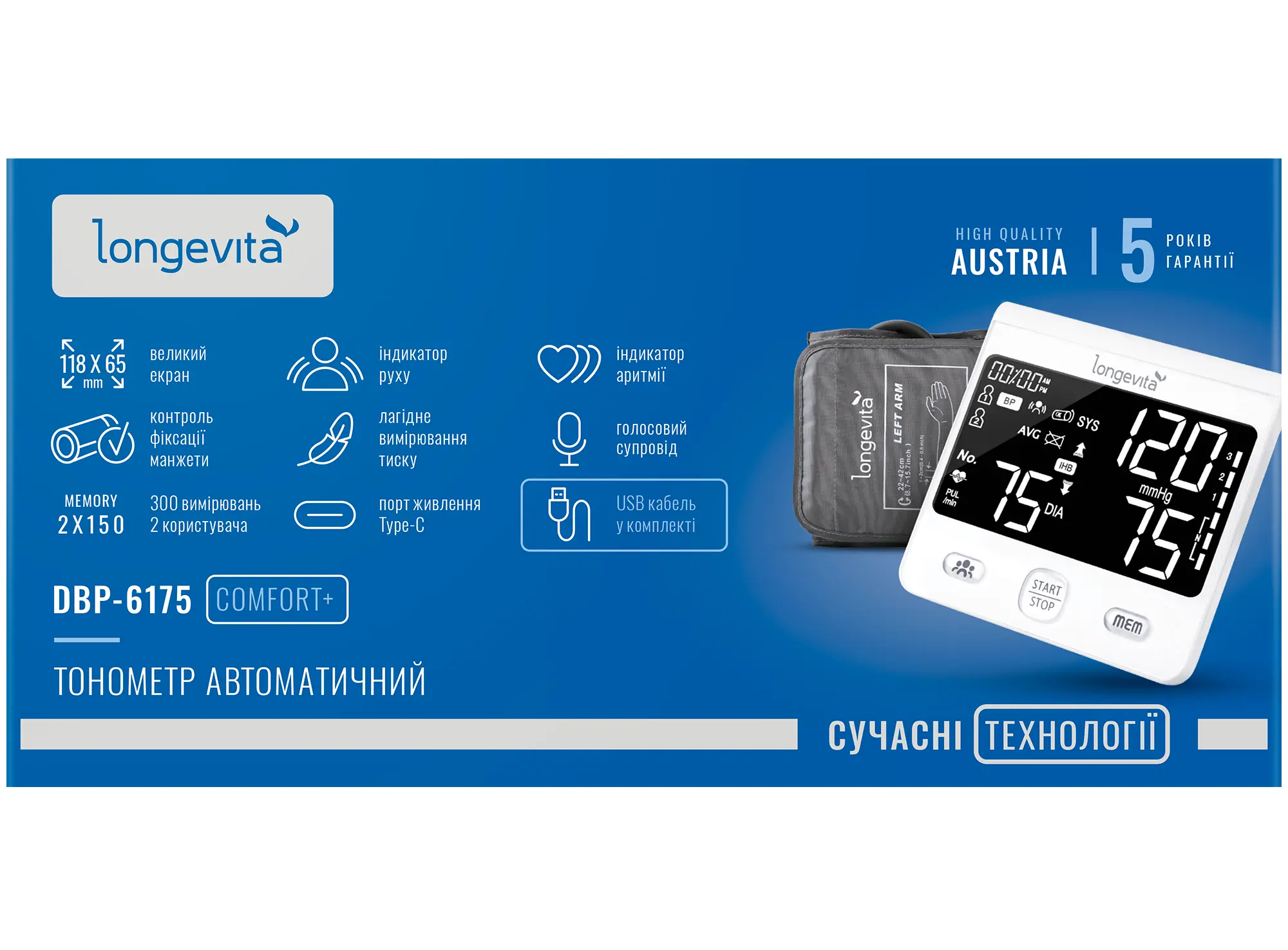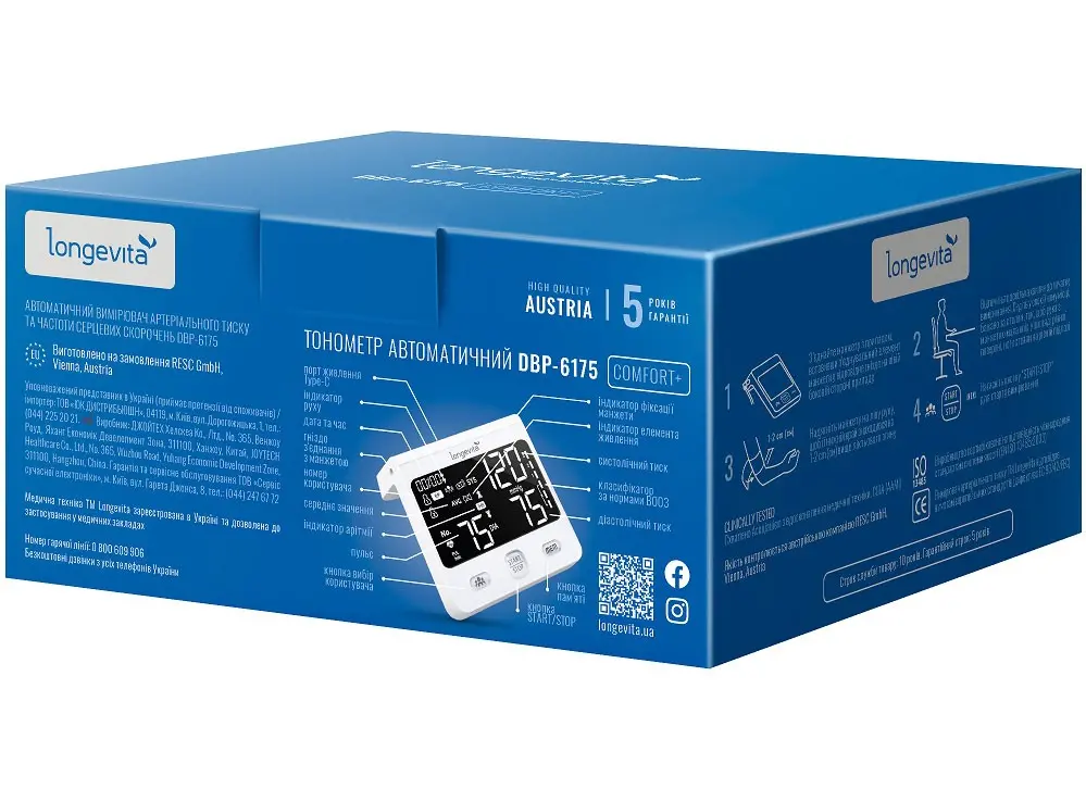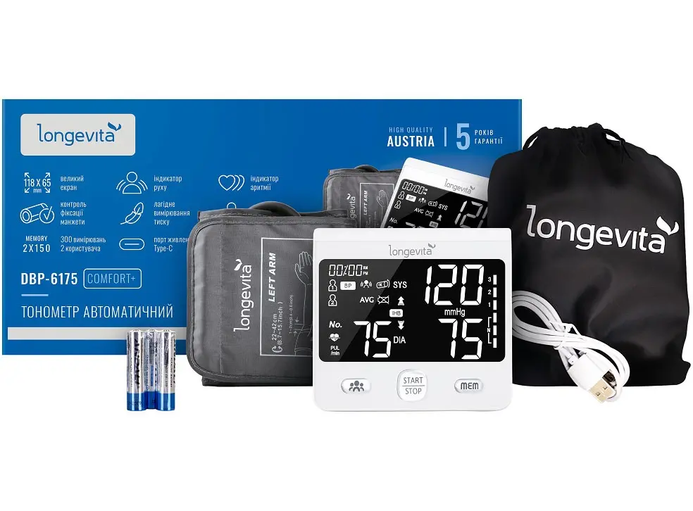 Черный дисплей (118 mm х 65 мм) с белой подсветкой • Голосовой помощник на украинском языке • Индикатор заряда батареи • Авто отключение • Память измерений для 2-х пользователей, 150 х 2 • Индикатор движения руки при измерении • Индикатор правильного расп