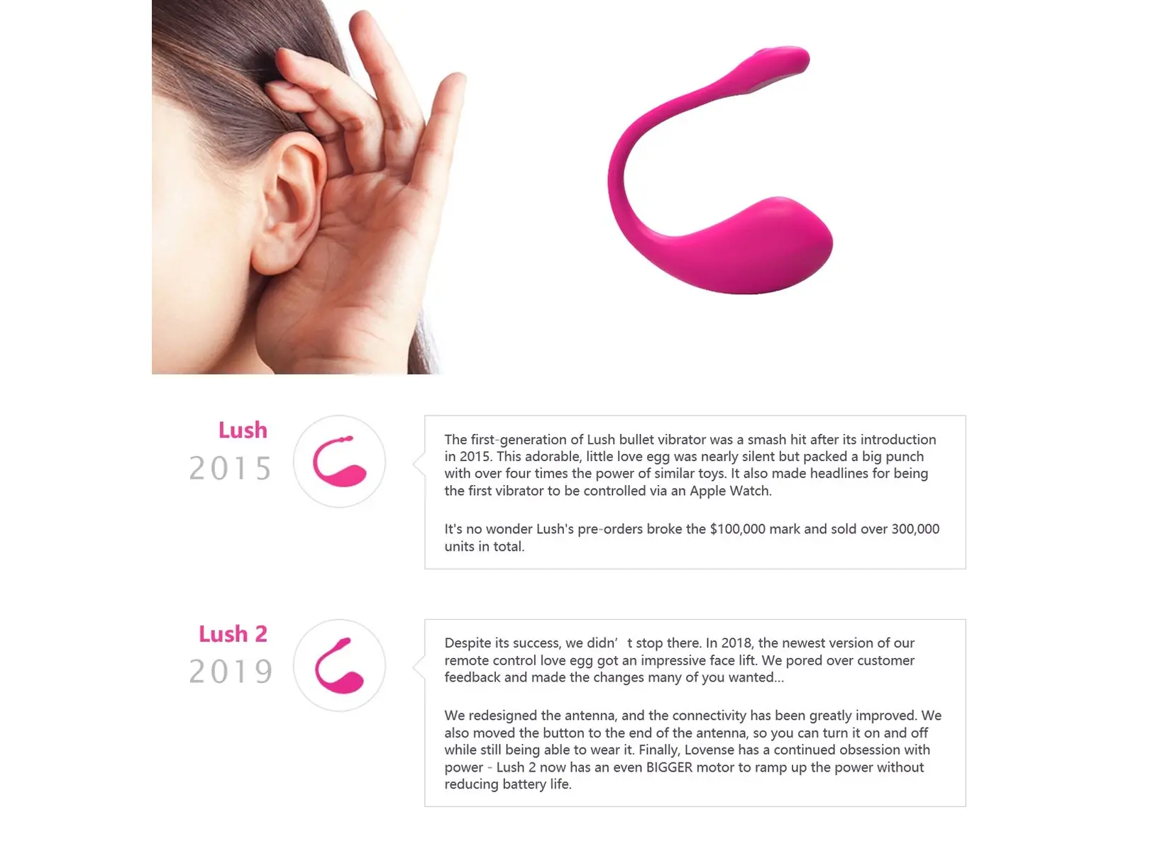 Lush 2.0 имеет выпуклость на кончике для усиления вагинальной стимуляции. Изделие изготовлено из силикона, отличающегося исключительной мягкостью и безопасностью для использования человеком. Кнопка включения/выключения перемещена на конец антенны для удобного доступа во время ношения устройства. Благодаря полной водонепроницаемости, его можно безопасно использовать в ванне или душе.
