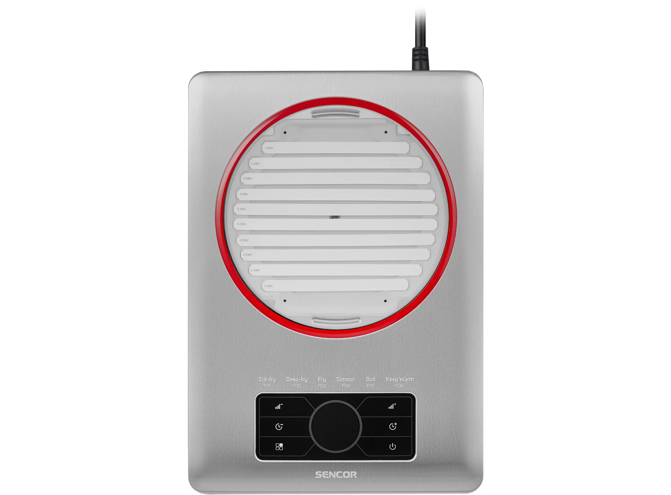 Сверхпроводниковая технология керамических нагревательных элементов • Цветное кольцо вокруг варочной панели • Для посуды диаметром до 28 см • Регулировка мощности с шагом 100 Вт • 6 режимов • Таймер (до 4 часов) • Длина шнура