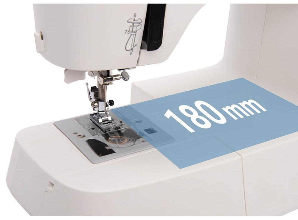 35 швейных программ • Петля за 1 шаг в автоматическом режиме • Автоматический нитевдеватель • Горизонтальный челнок • Рабочее пространство справа от иглы - 180 мм • Плавная регулировка параметров строчки • Длина стежка - до 4 мм • Ширина строчки - до 6 мм