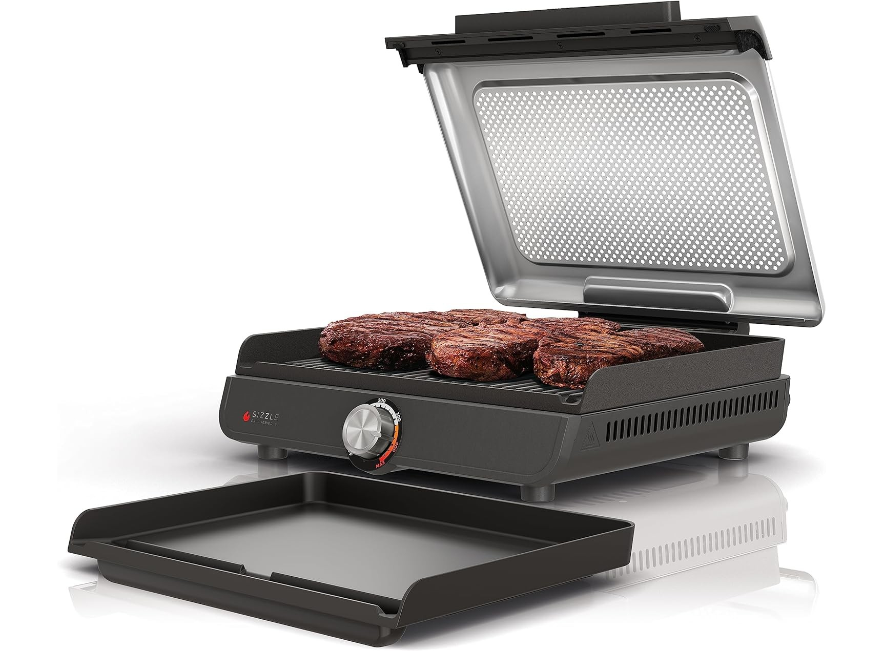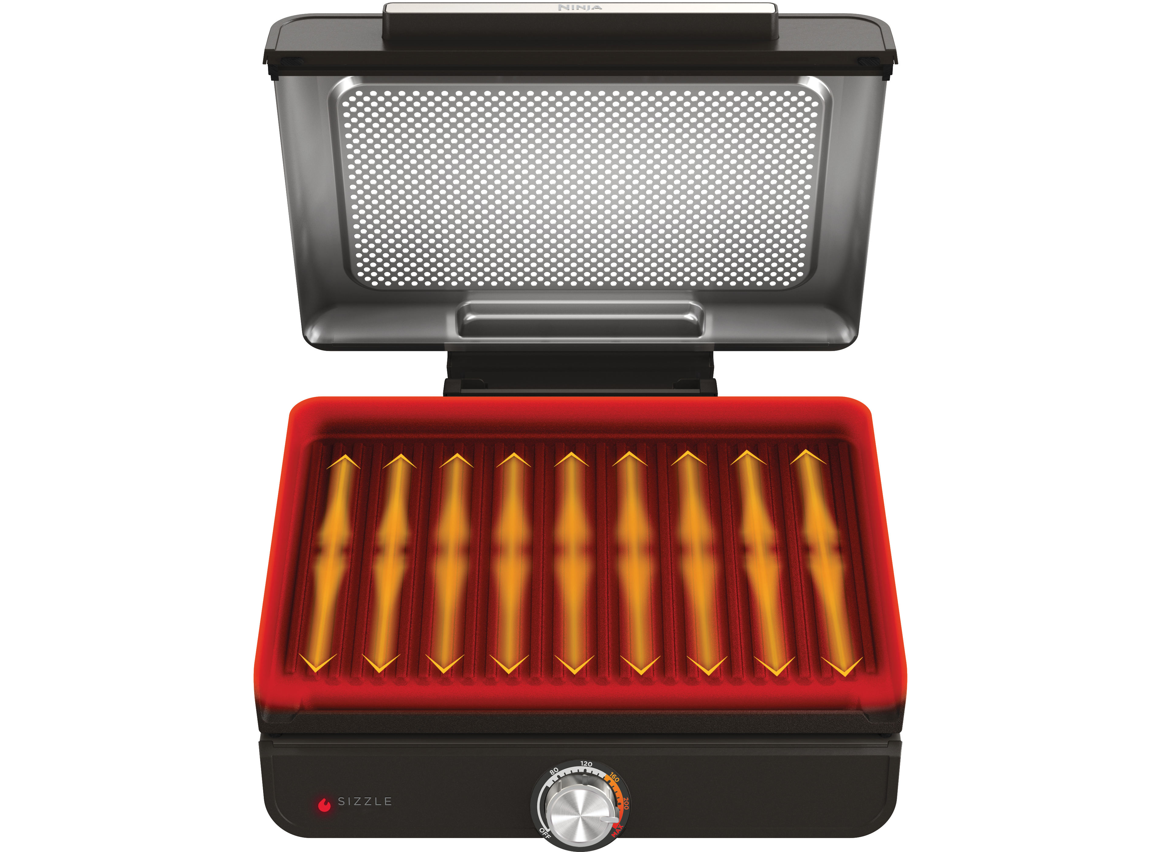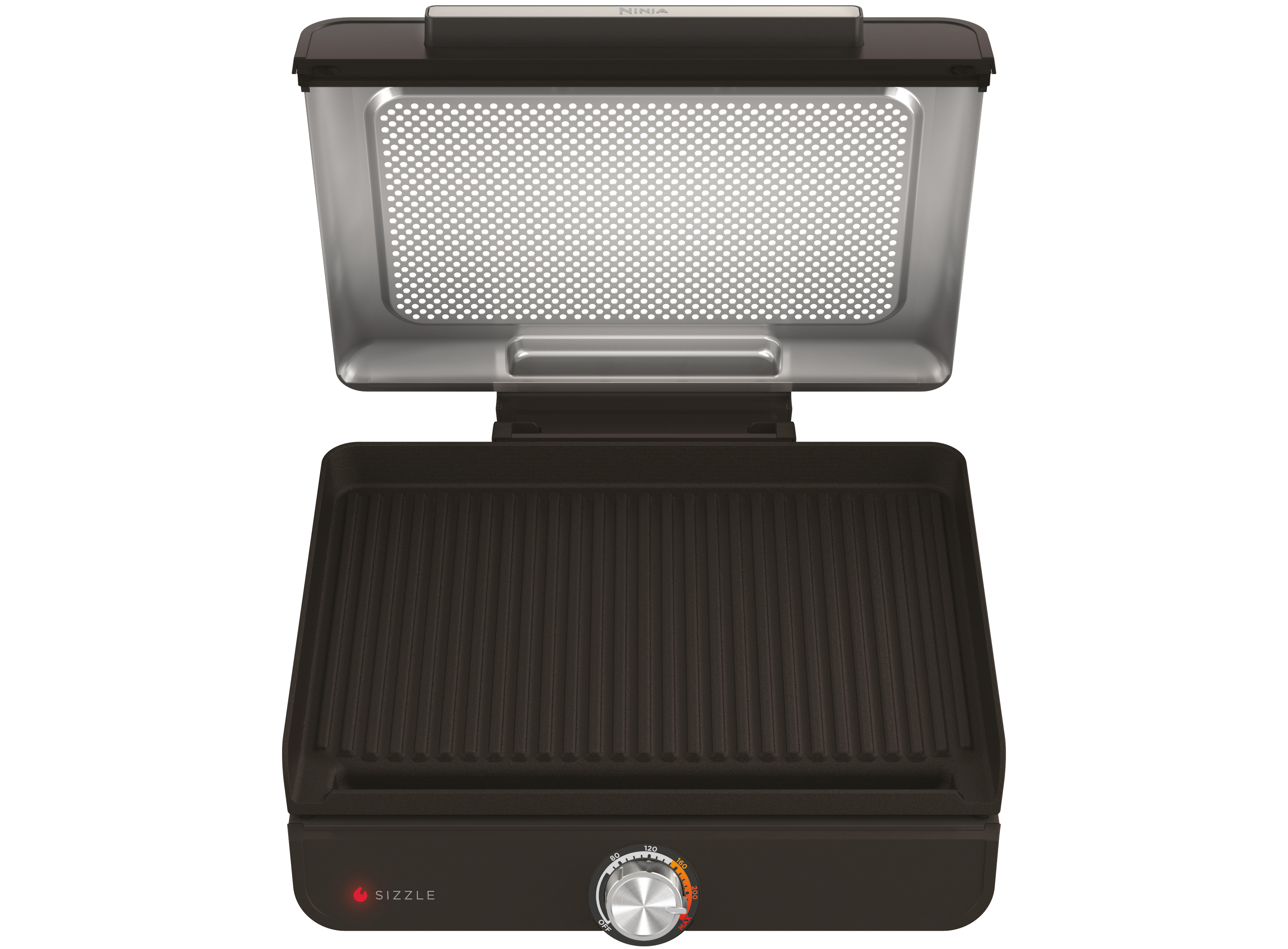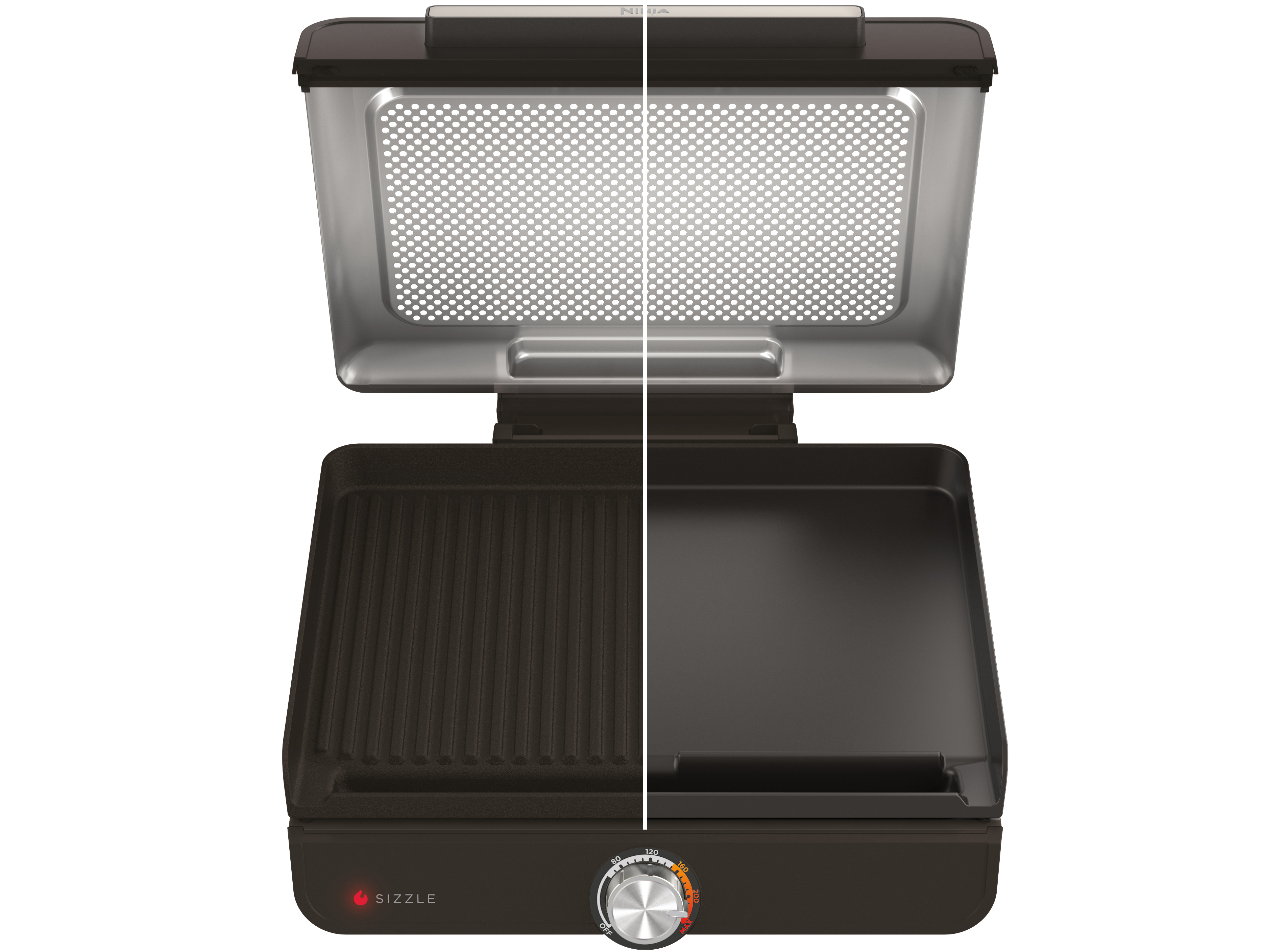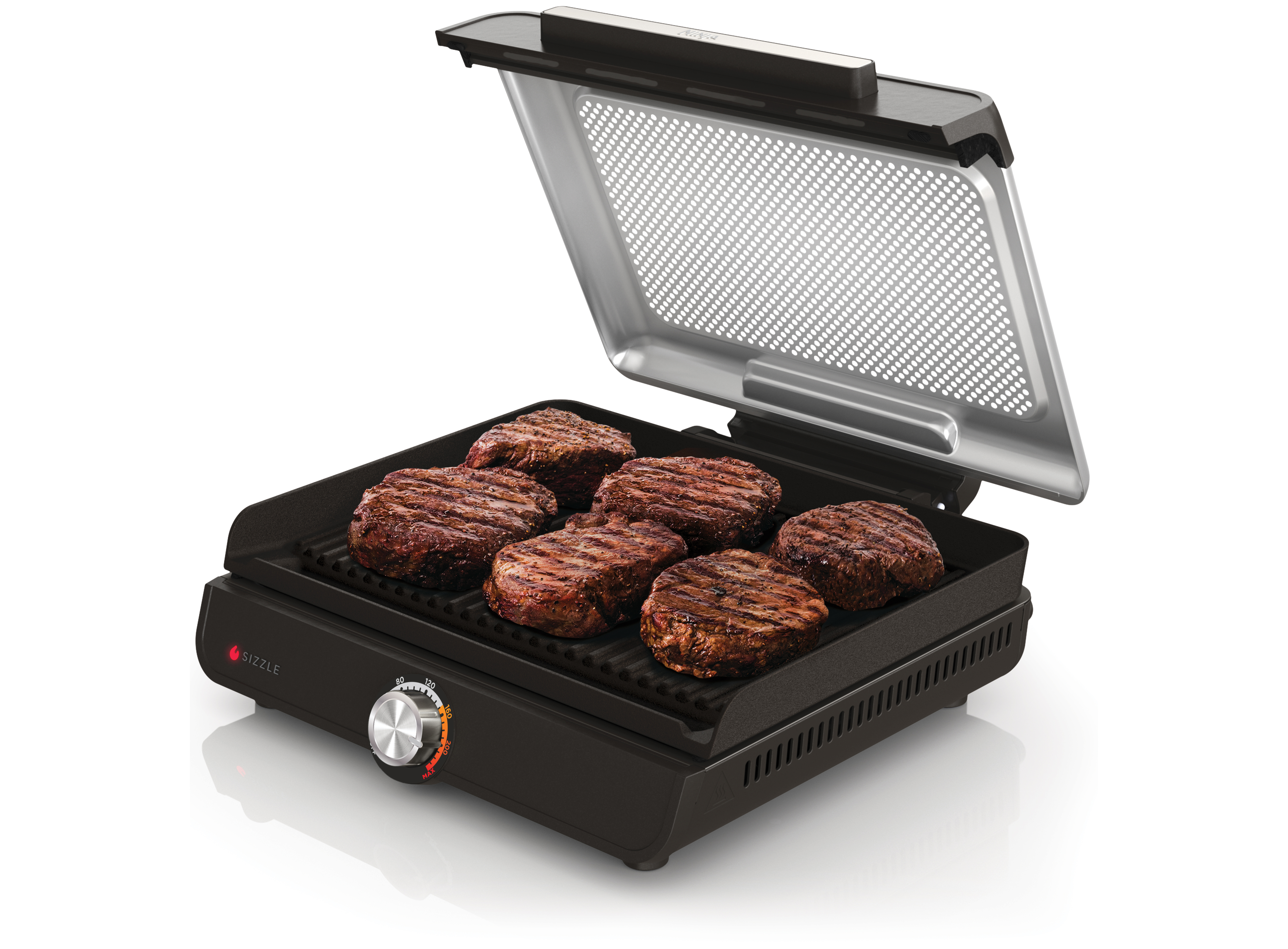 Индикатор нагрева • Индикатор работы • Пластины можно мыть в посудомоечной машине • Крытый гриль с низким дымлением и сменной пластиной для гриля и плоской пластиной • Вместимость семейного размера вмещает до 6 гамбургеров, куриных грудок или блинов • Нас