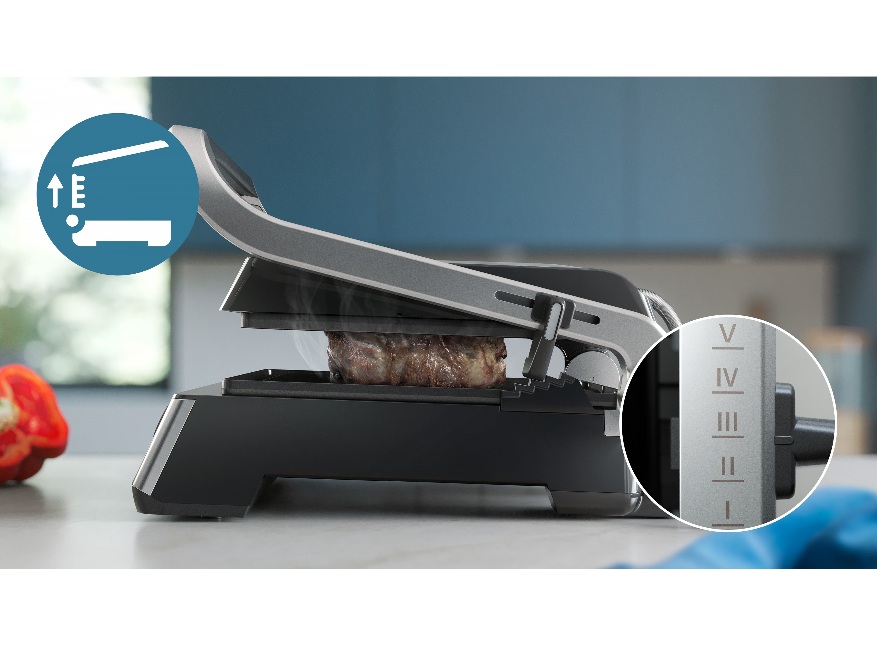 Съемные части легко чистить • Высокая мощность для быстрого приготовления • Регулируемая температура для идеальных результатов • Возможность регулировки высоты позволяет готовить все ваши любимые блюда • Большая поверхность гриля (750 см²) позволяет готов