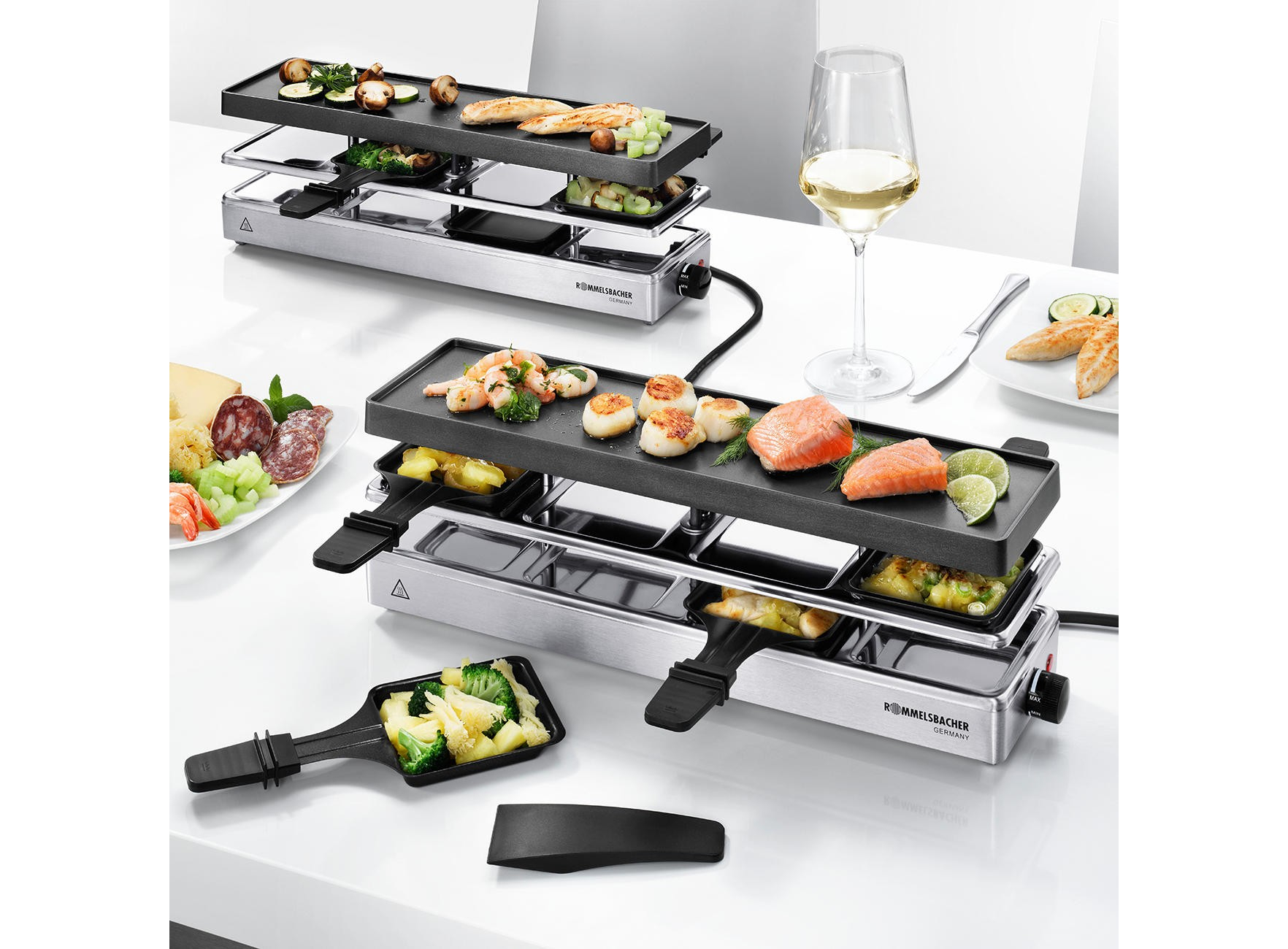 2 раклетницы Rommelsbacher RC 1600 Fun for 4+4 • 8 сковород (7 x 7.5 см) с антипригарным покрытием и термоизолированными ручками • 8 лопаток для переворачивания продуктов • 2 шнура питания • 1 соединительный шнур