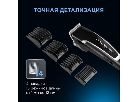 Срез от 1 до 12 мм • Лезвия из нержавеющей стали • Работа от шнура • Стильный, удобный дизайн • Лезвия можно мыть под водой • Мощный долговечный AC мотор • Точная детализация: 15 режимов длины от 1 мм до 12 мм • Удобное управление благодаря колесику • Лег