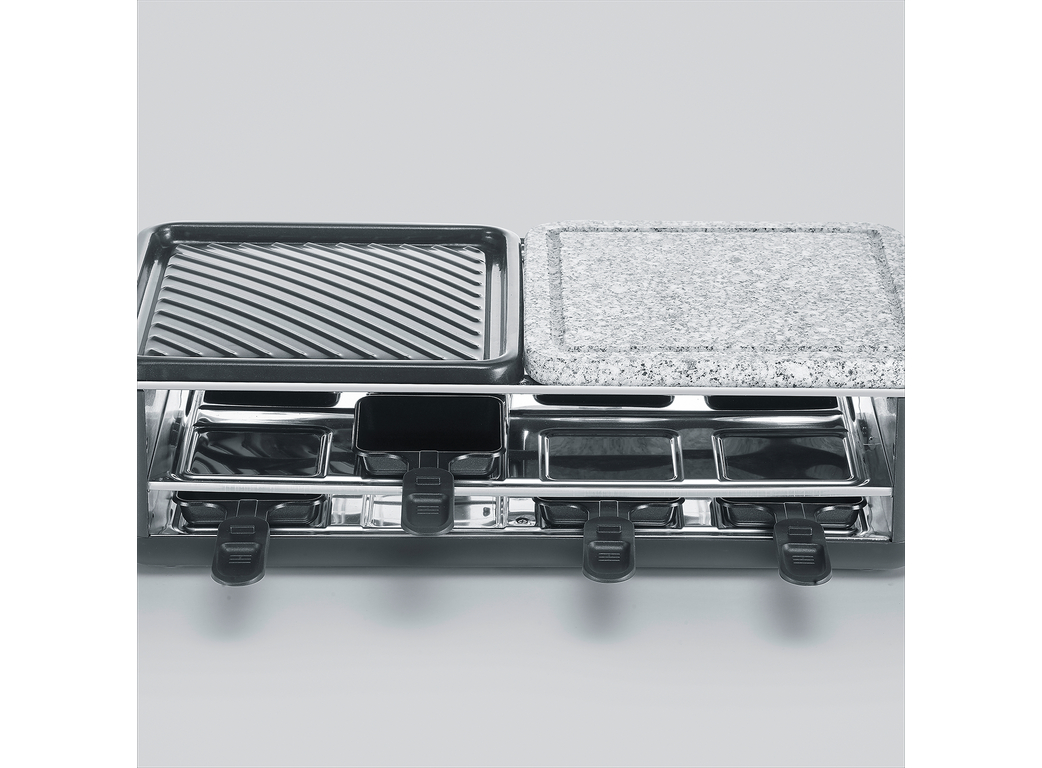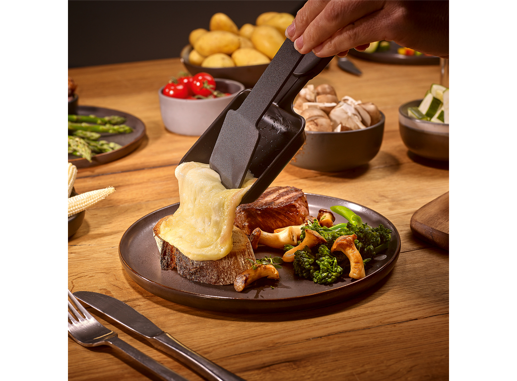 8 сковородок для раклет глубиной 20 мм с антипригарным покрытием • Рифленая керамическая пластина гриля с антипригарным покрытием • Контроль температуры • Некоторые части можно мыть в посудомоечной машине • Функция "клик-стоп"