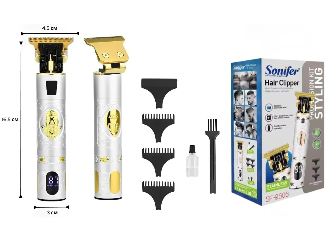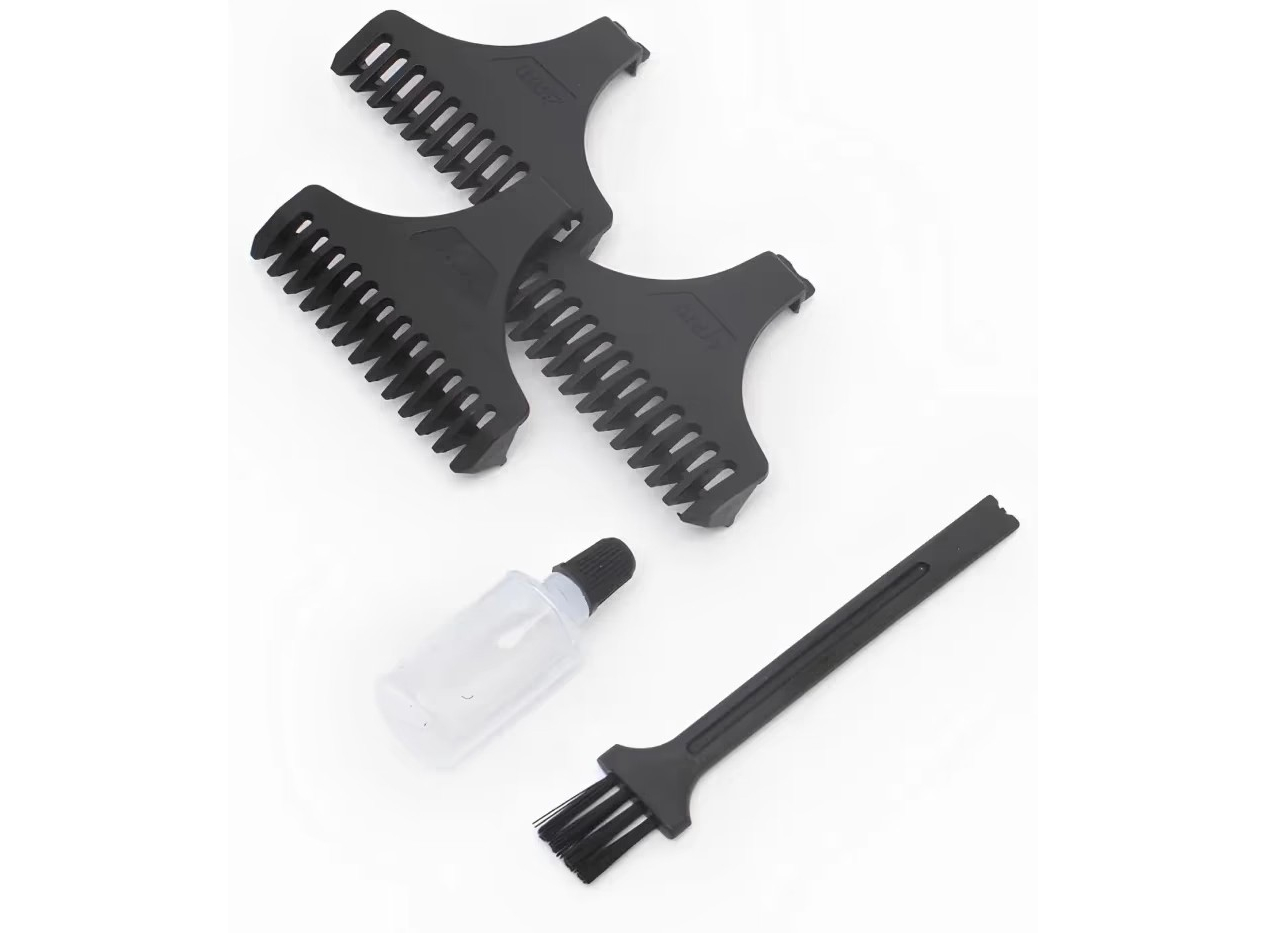 Машинка для стрижки • Насадки х 4 шт. • Щетка для очистки • Кабель для зарядки • Масло для смазки • Машинка • Инструкция