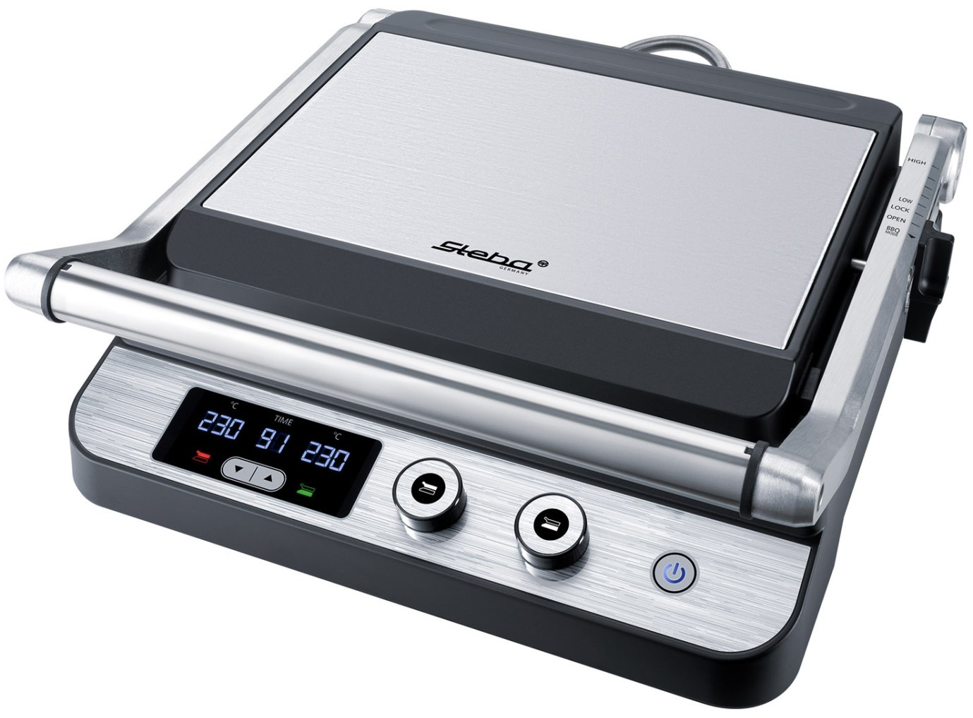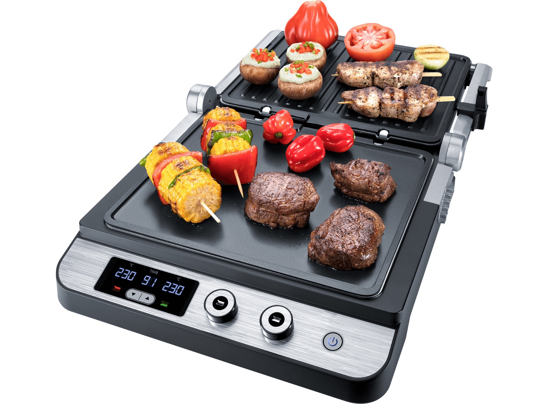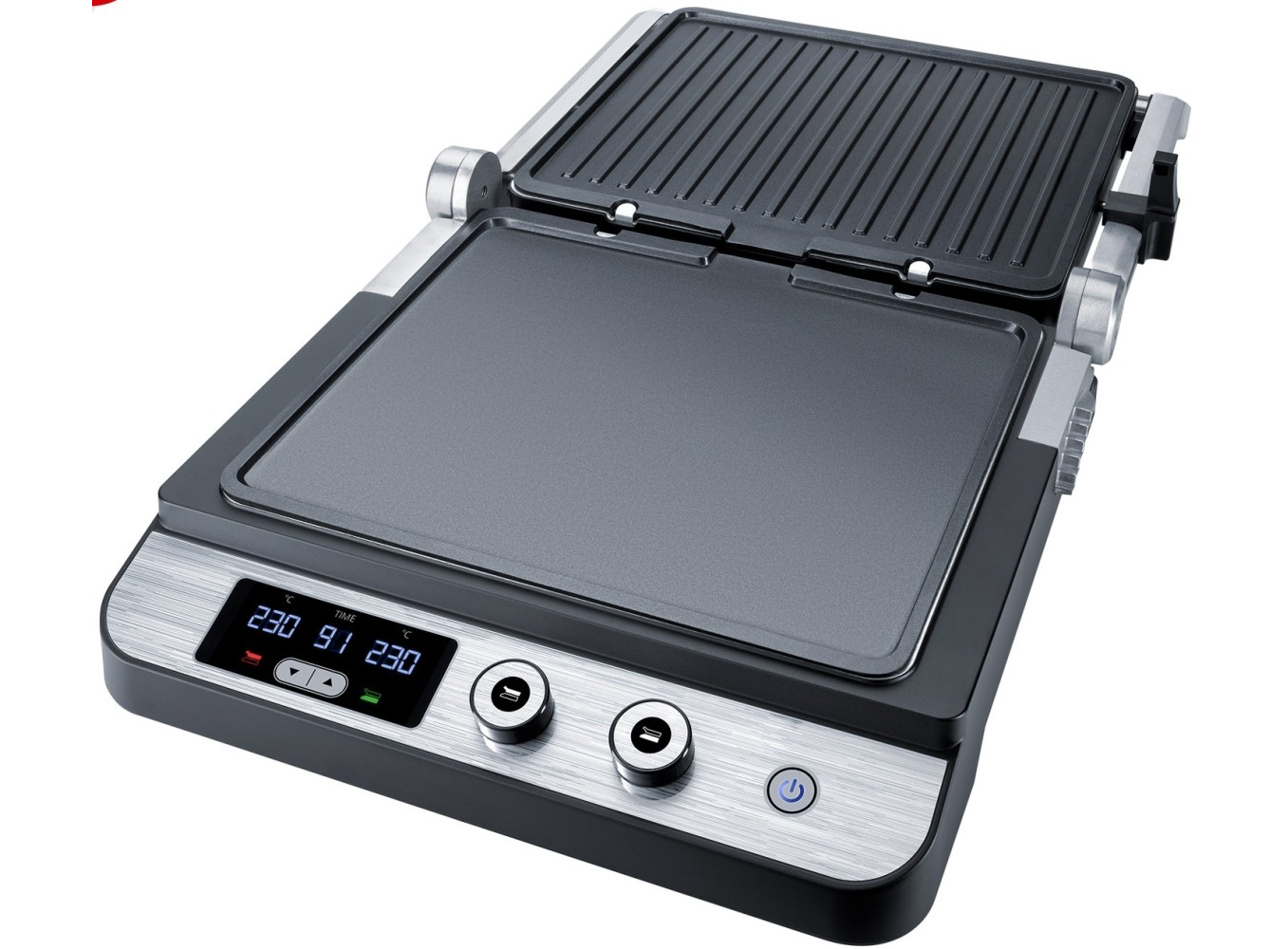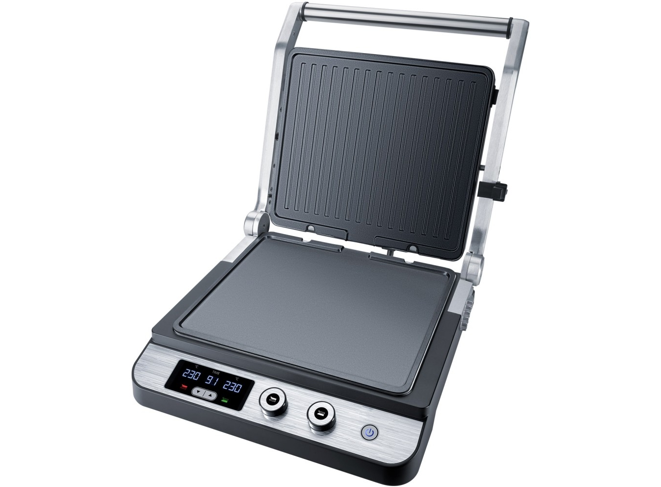 Корпус из нержавеющей стали • Индивидуальная регулировка температуры до 230°C для верхней и нижней пластин гриля • Таймер на 99 мин • Светодиодный дисплей для отображения температуры и таймера • Съемные пластины гриля для легкой очистки • Функция низкого