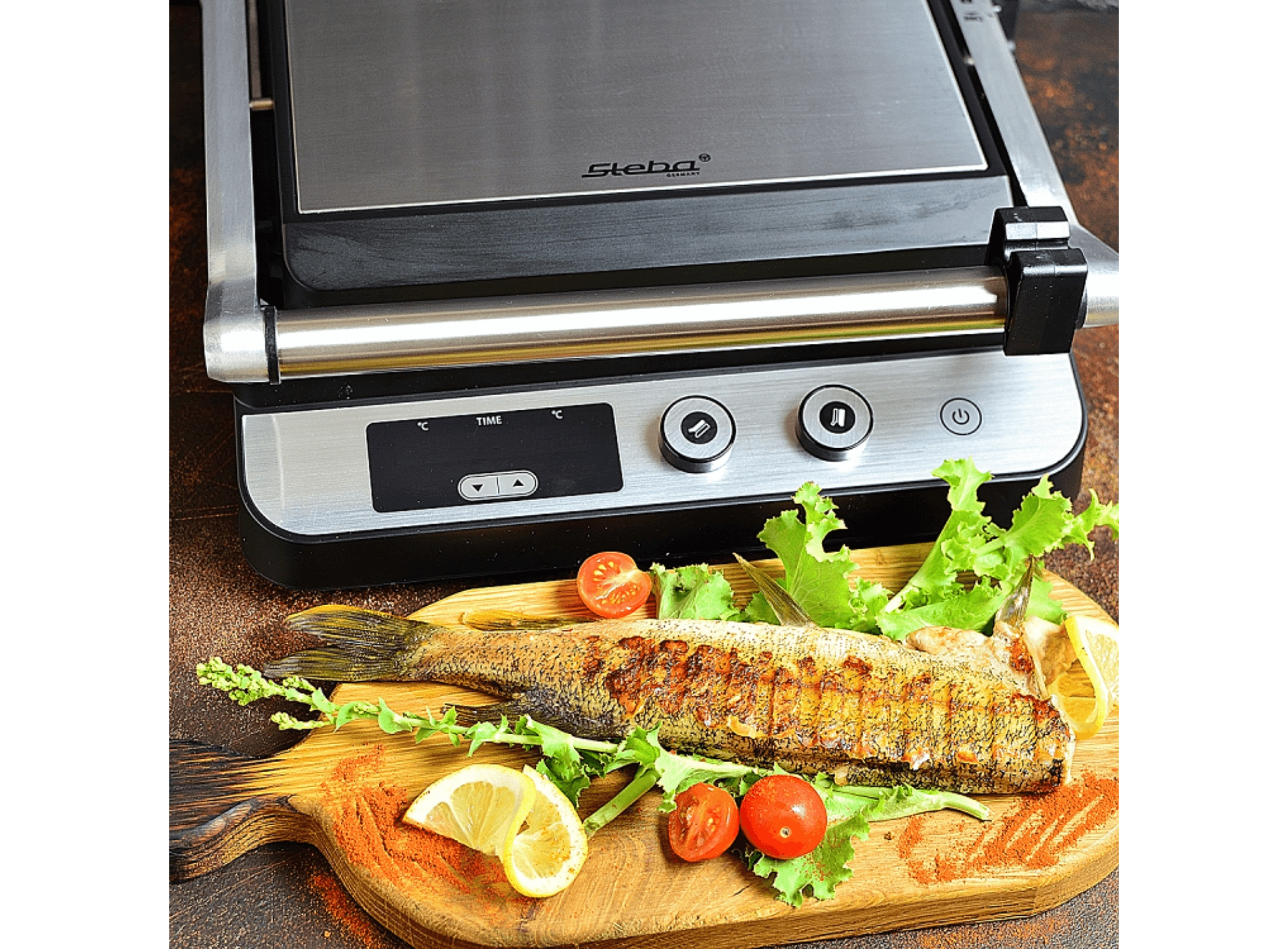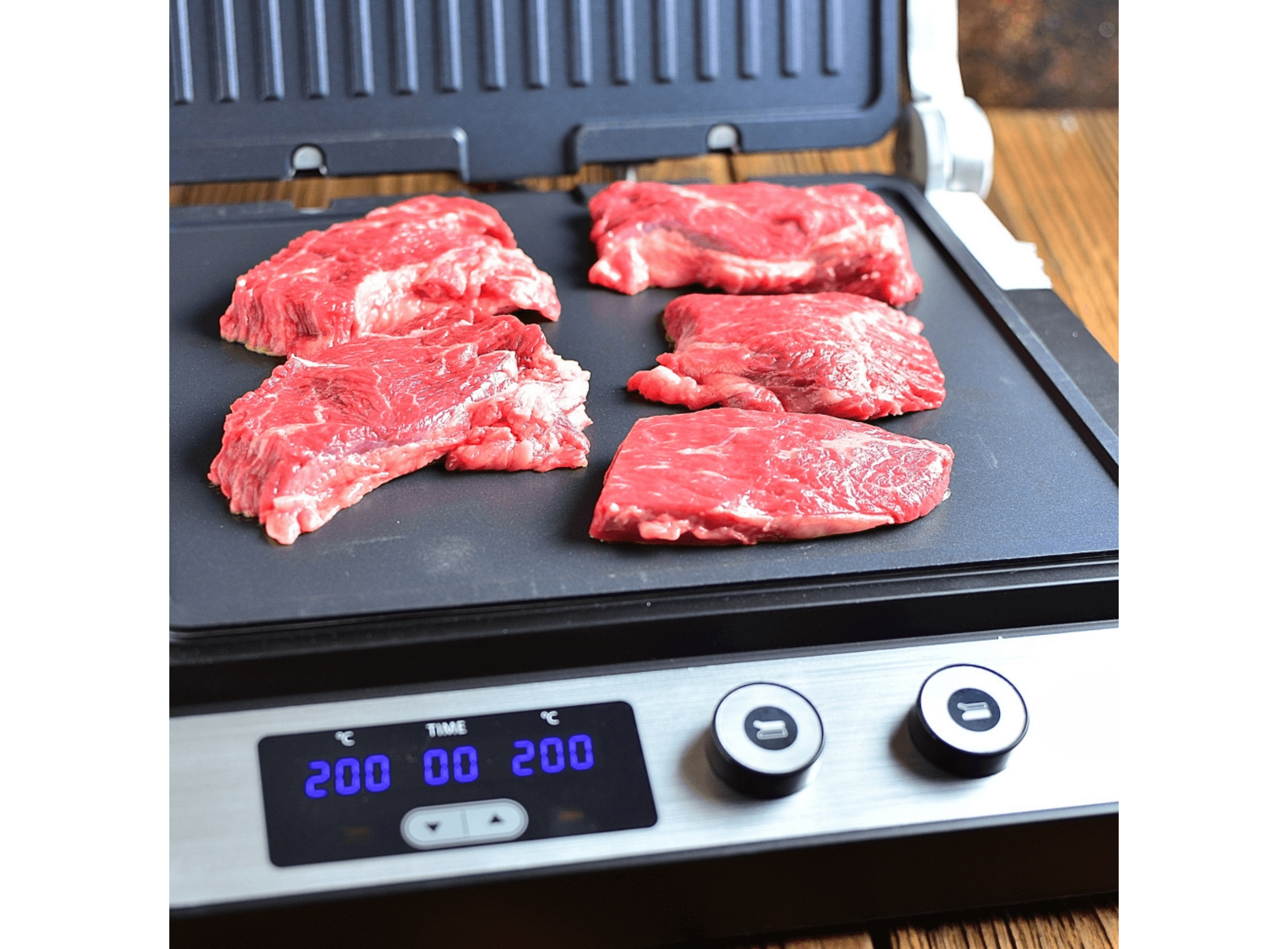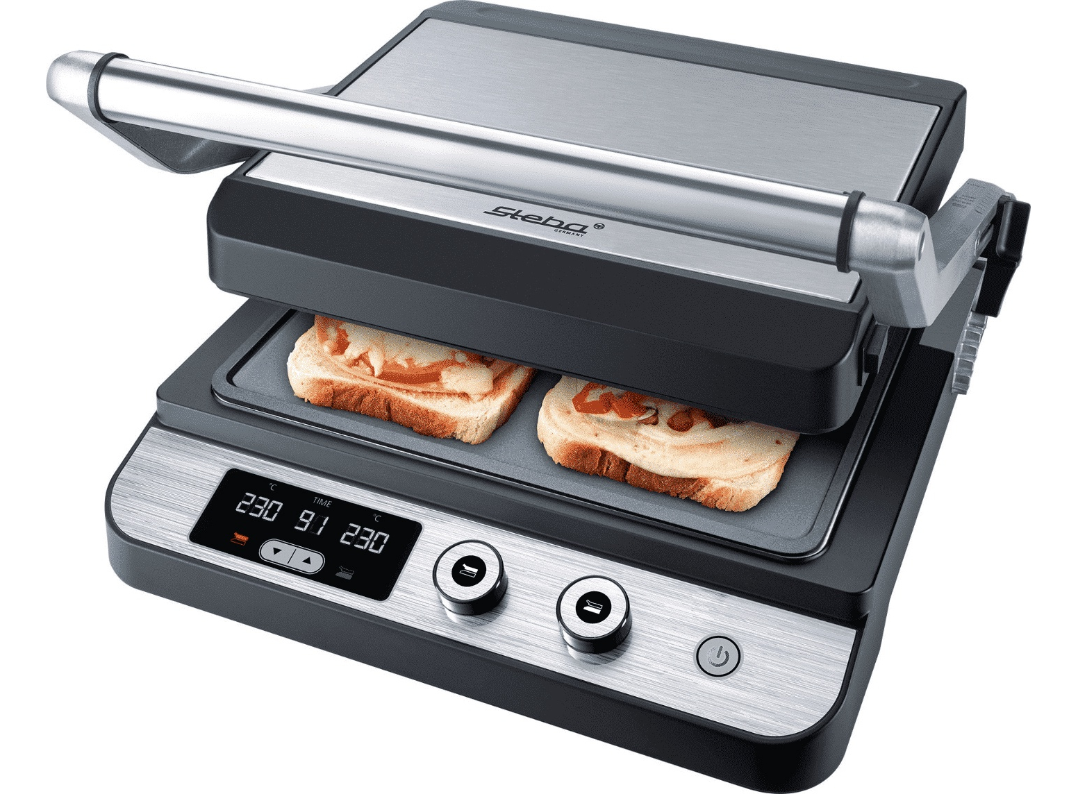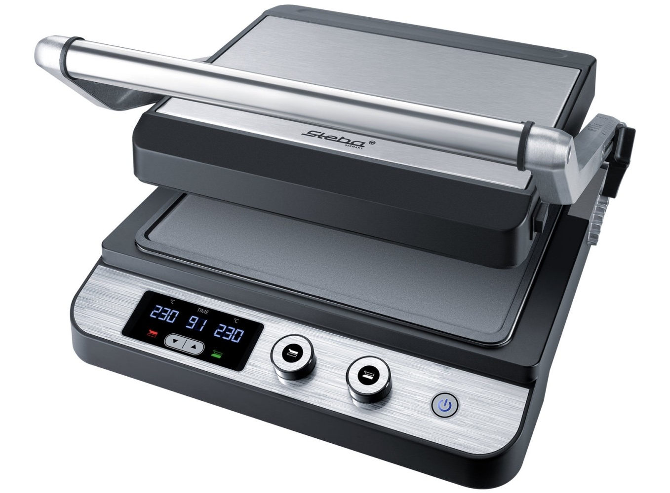 Корпус из нержавеющей стали • Индивидуальная регулировка температуры до 230°C для верхней и нижней пластин гриля • Таймер на 99 мин • Светодиодный дисплей для отображения температуры и таймера • Съемные пластины гриля для легкой очистки • Функция низкого