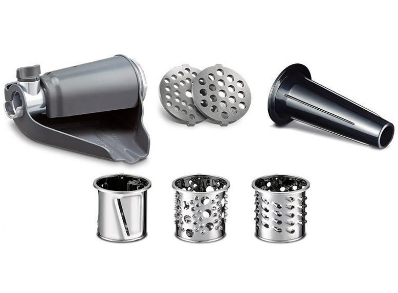 Мясорубка • Насадка для колбасных изделий • Насадки для терки и шинковки 3 шт. • Насадка для ягод и томатов • Решетки 2 шт.
