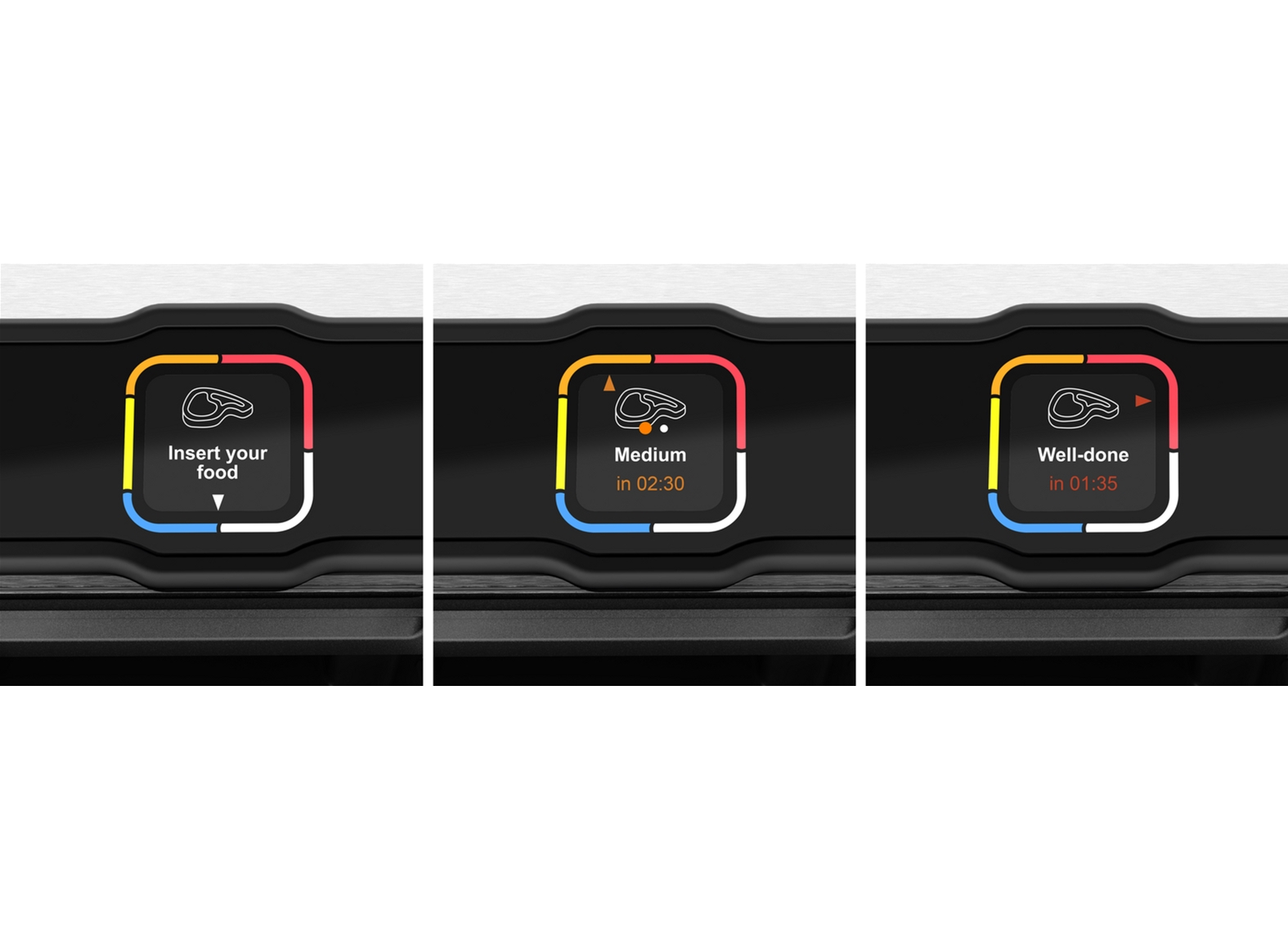 600 см² рабочей поверхности • Съёмные толстые пластины с антипригарной поверхностью из литого алюминия • Угол наклона панели — 7° (для стекания жира и лёгкой очистки) • Гриль измеряет толщину куска мяса и определяет автоматически желаемый уровень прожарки