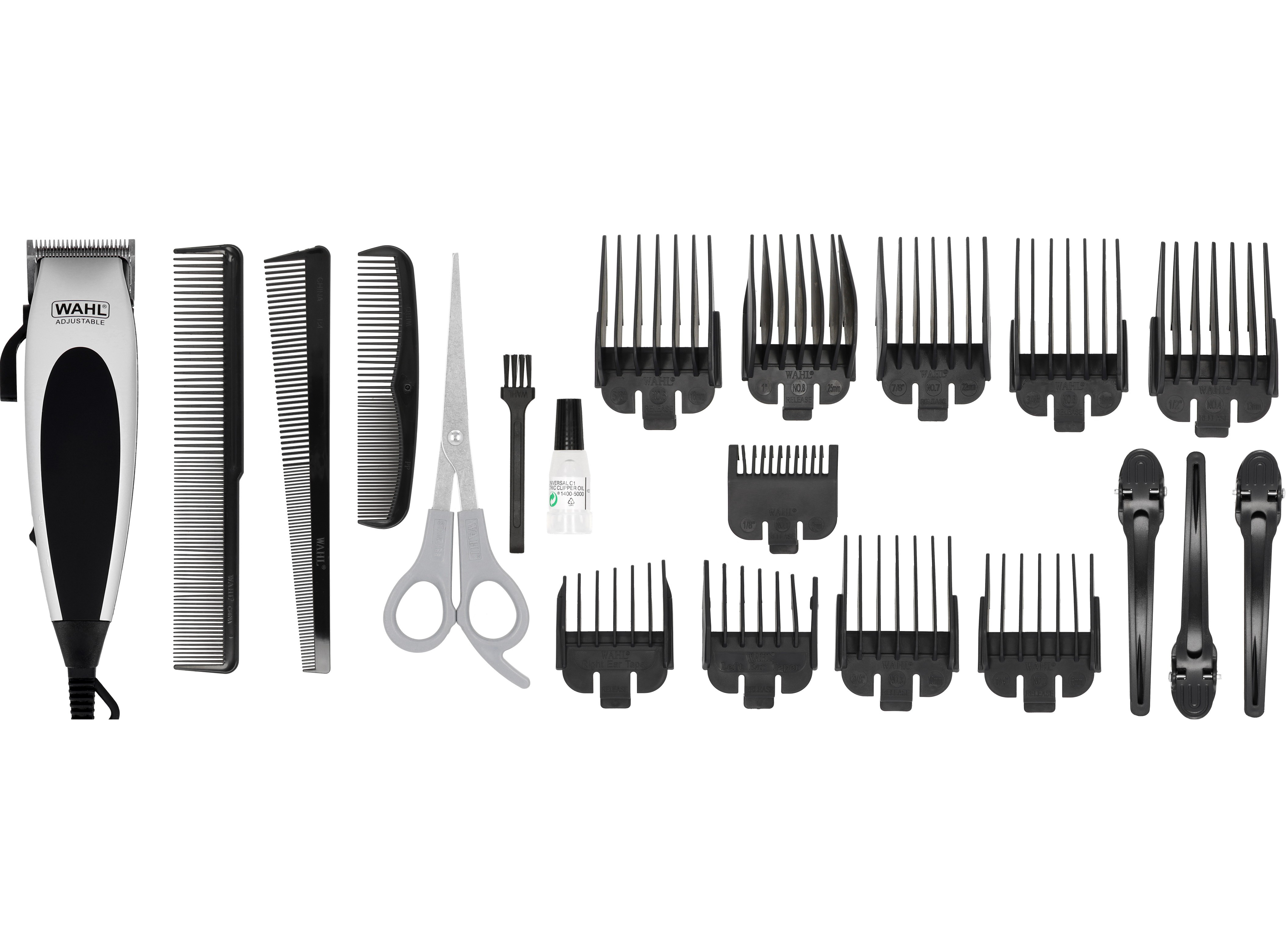 8 насадок (3, 6, 10, 13, 16, 19, 22, 25 мм) • Насадки для левого и правого уха • Защита лезвия • Корпус • Расческа парикмахера • Расческа для стайлинга • Карманная расческа • Ножницы • Зажимы для волос (3 шт) • Смазка для лезвий • Щетка для чистки