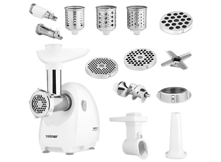 Мясорубка • Двусторонний нож • Решетка: 3 шт. • Насадка для колбасы • Насадка для терки и шинковки: 3 шт. • Соковыжималка для помидоров • Насадка "Кеббе" • Лоток для подачи мяса • Толкатель